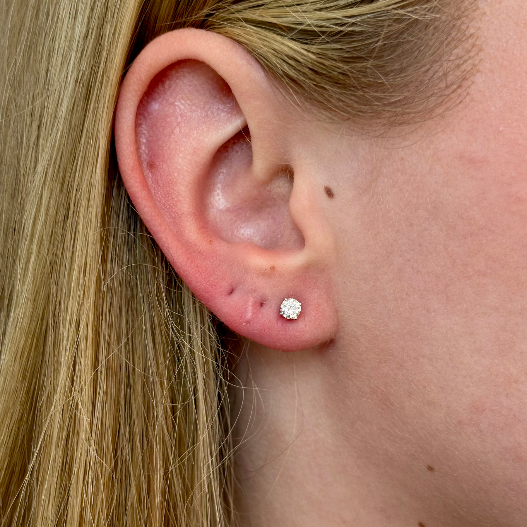 A brilliant choice with smart value, these 0.40ct total weight natural diamond studs are set in classic 14K white gold 4-prong traditional basket style mountings. Each diamond measures 3.75 millimeters in size. The white G-I color graded diamonds feature a clarity grade of SI3/I1, offering a beautiful look and accessibly priced. Timeless and versatile, they make an ideal gift or everyday essential.