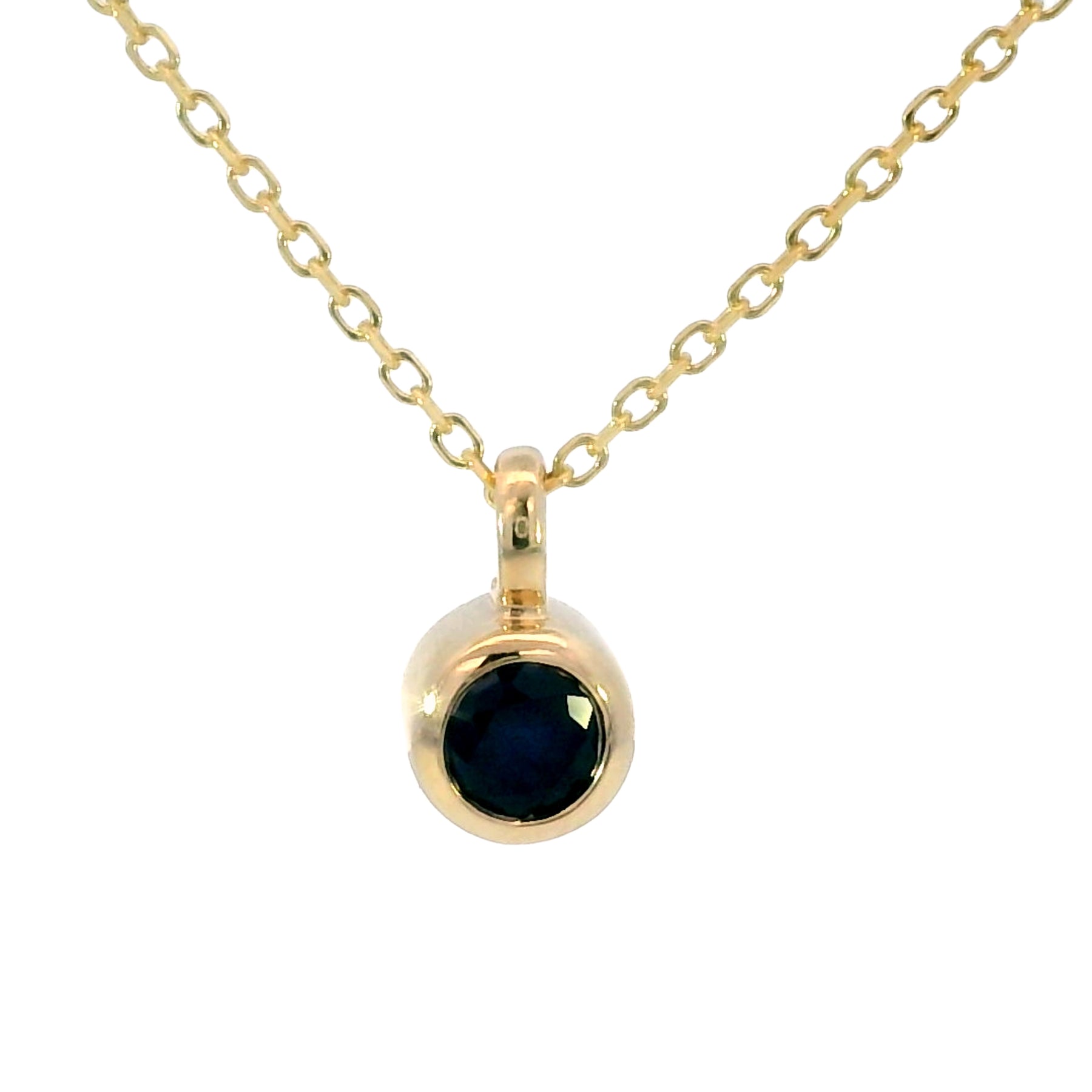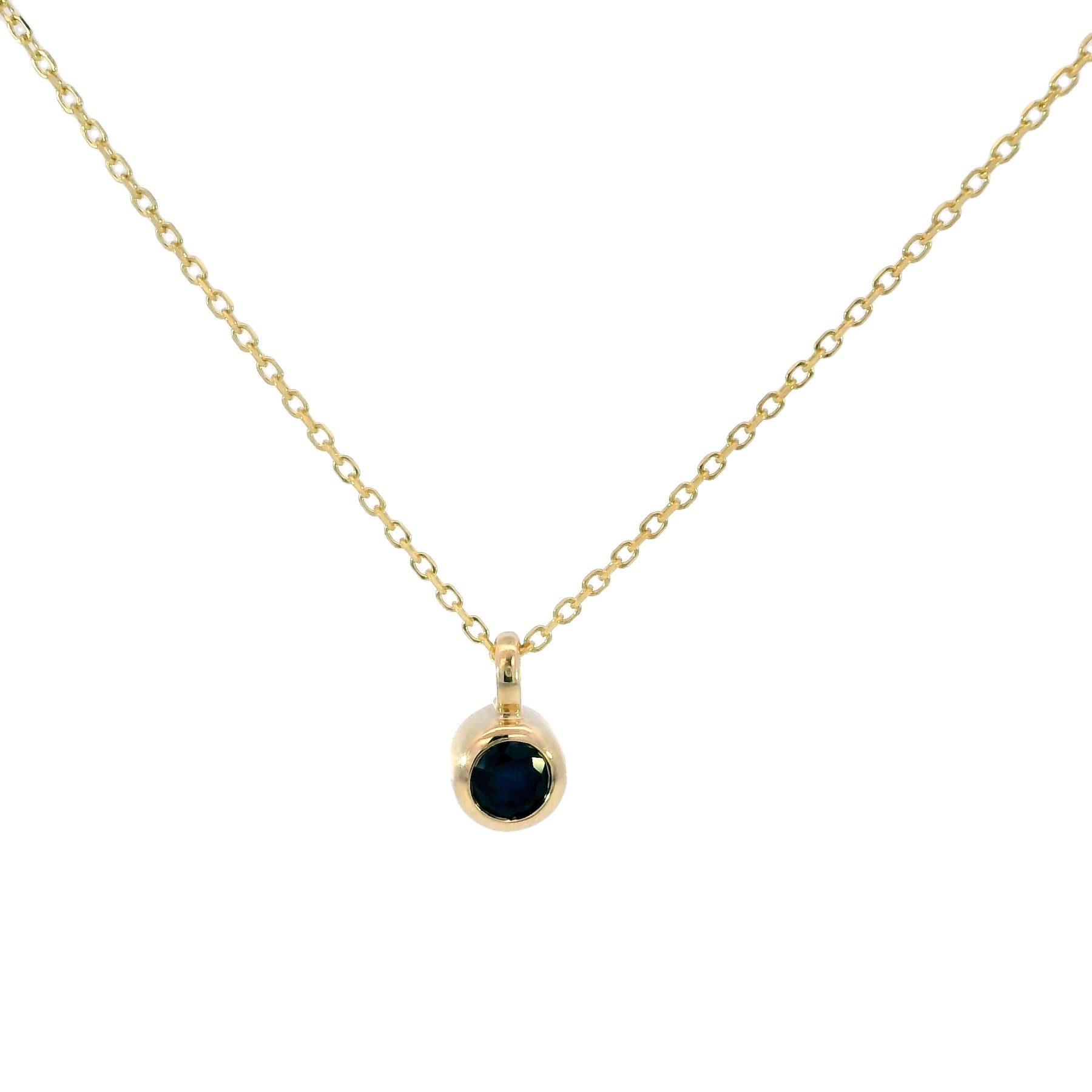 A vibrant .27ct round sapphire, September’s cherished birthstone, is bezel-set in a sleek and minimal 14k yellow gold pendant. Suspended from an 18-inch adjustable chain with a secure lobster clasp, this piece offers timeless elegance and personal significance—perfect for everyday wear or meaningful gifting.