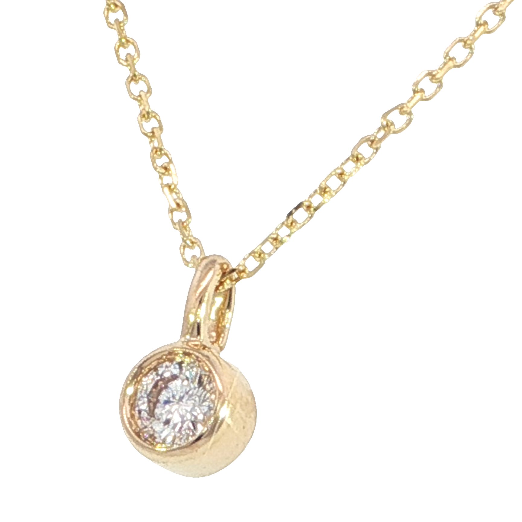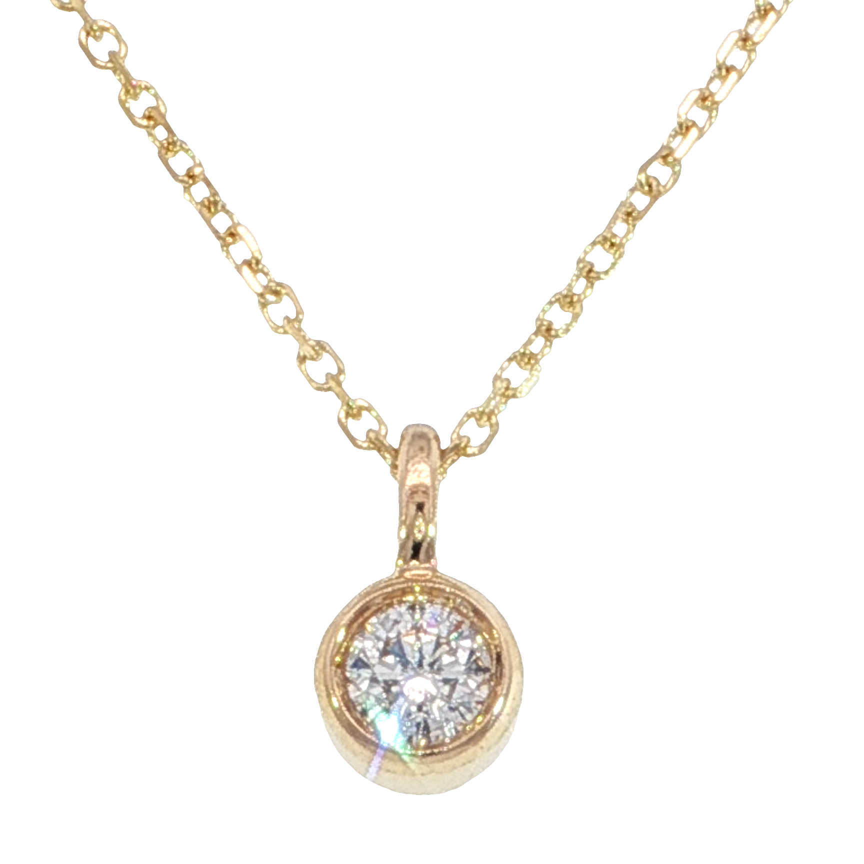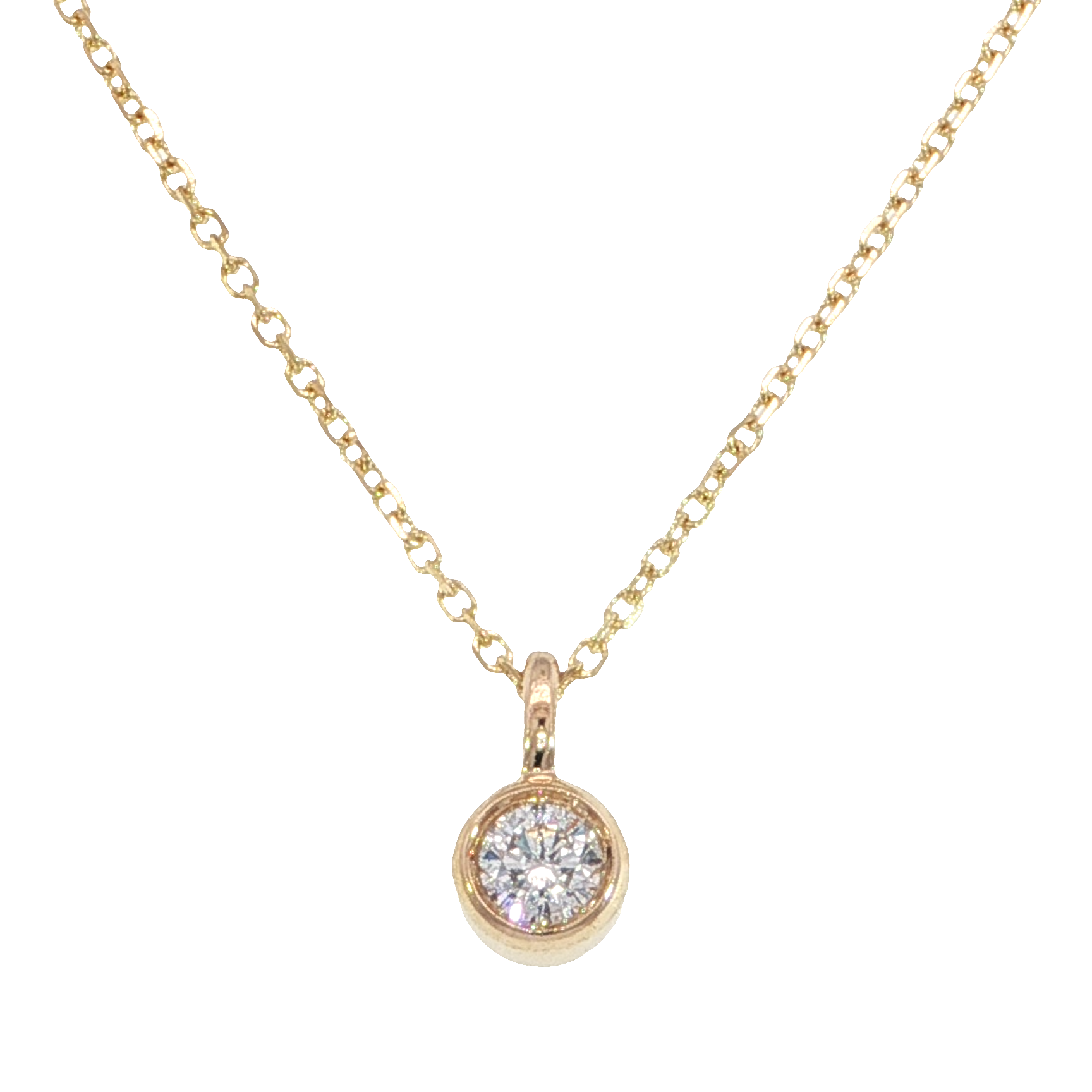 Delicately crafted in 14K yellow gold, this Bezel Style mini pendant features a brilliant round .10 carat diamond set into an illusion bezel with an outer diameter measuring 4.37mm . Suspended from an 18-inch cable chain with a secure lobster clasp and adjustable length, it’s a timeless piece perfect for layering or everyday wear.