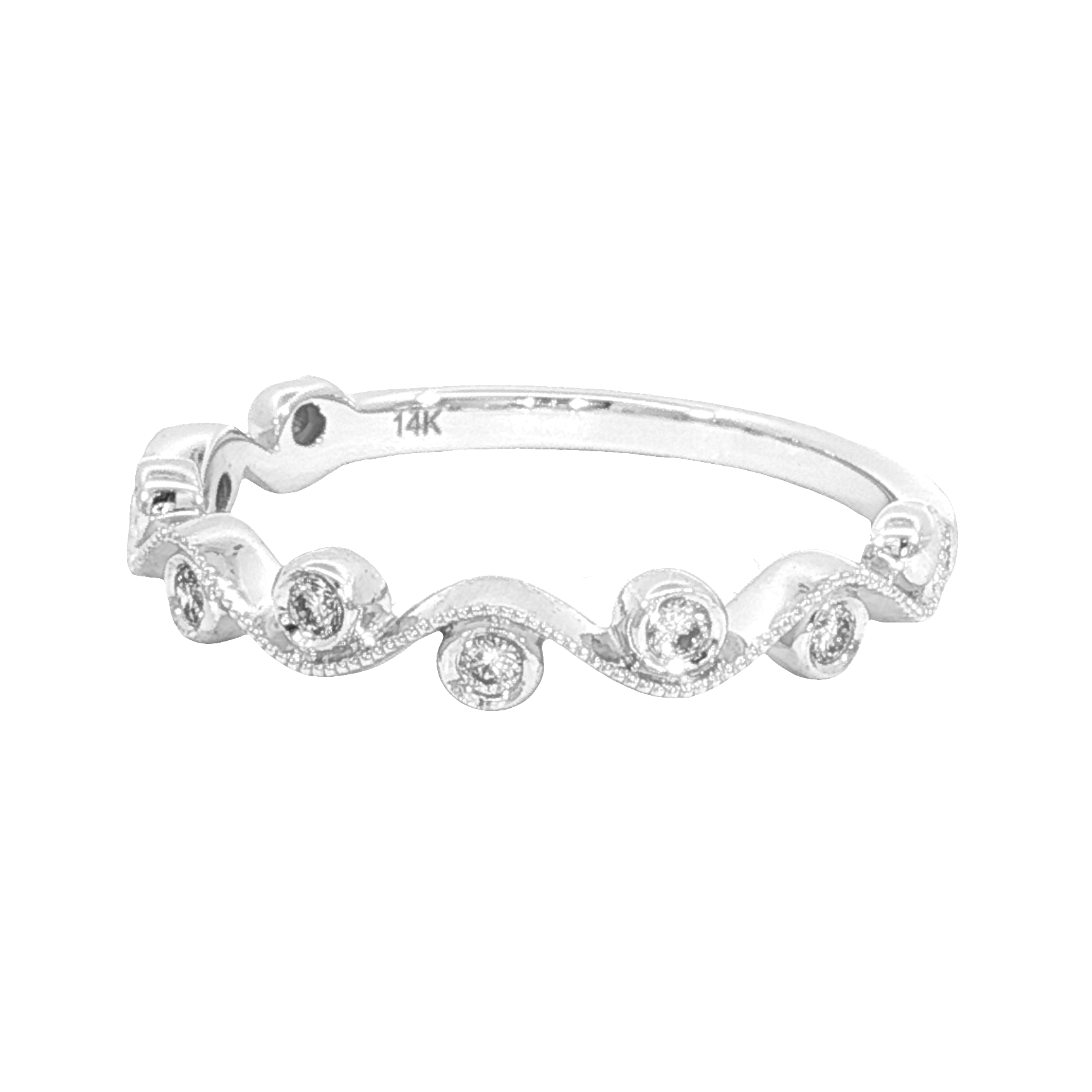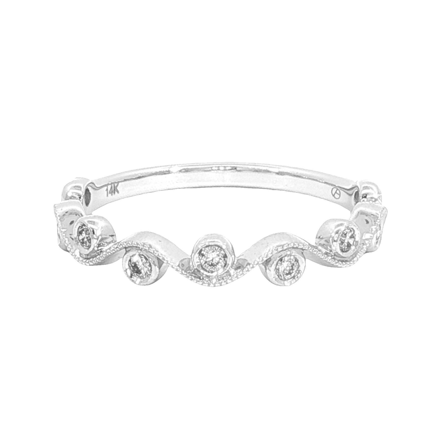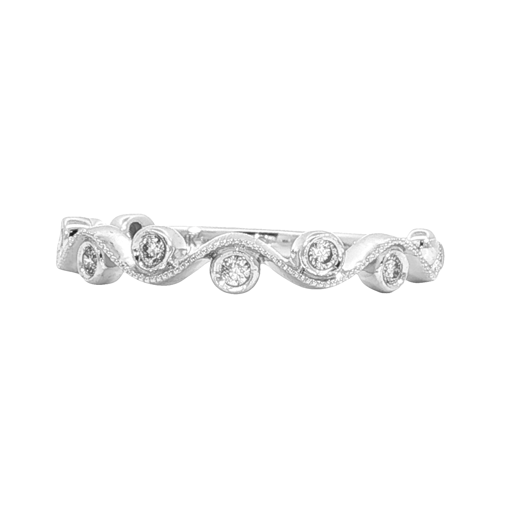 A graceful curvy band accented with milgrain detail holds seven bezel-set natural round diamonds. The diamonds total .10 carat, H color, I1 clarity, adding subtle sparkle to the vintage-inspired design.