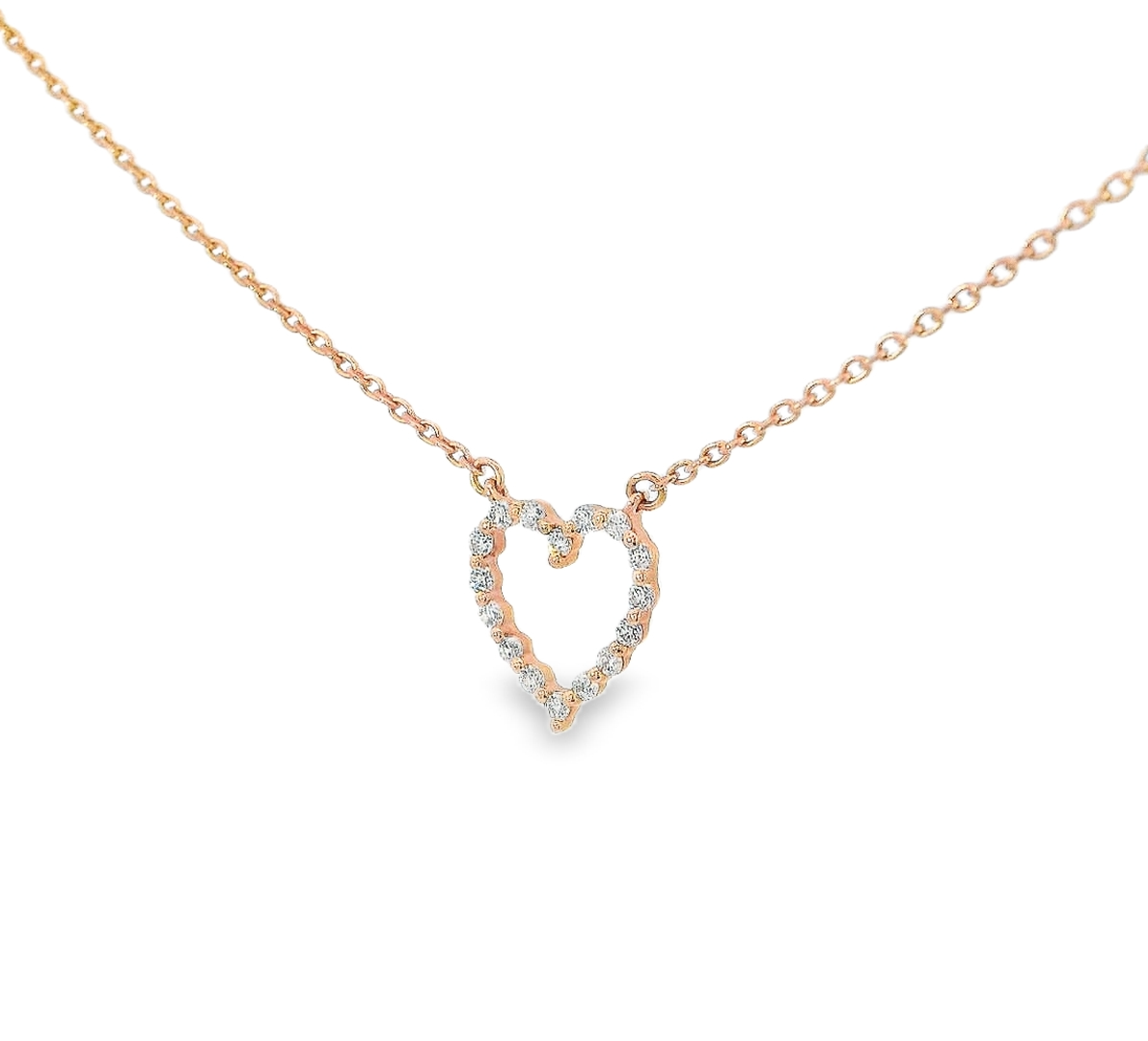 A delicate open heart sparkles with .10ct of round diamonds, gracefully set at the center of a warm 14k rose gold cable chain. With an adjustable 18-inch length, this necklace offers a timeless symbol of love with a soft, feminine touch.