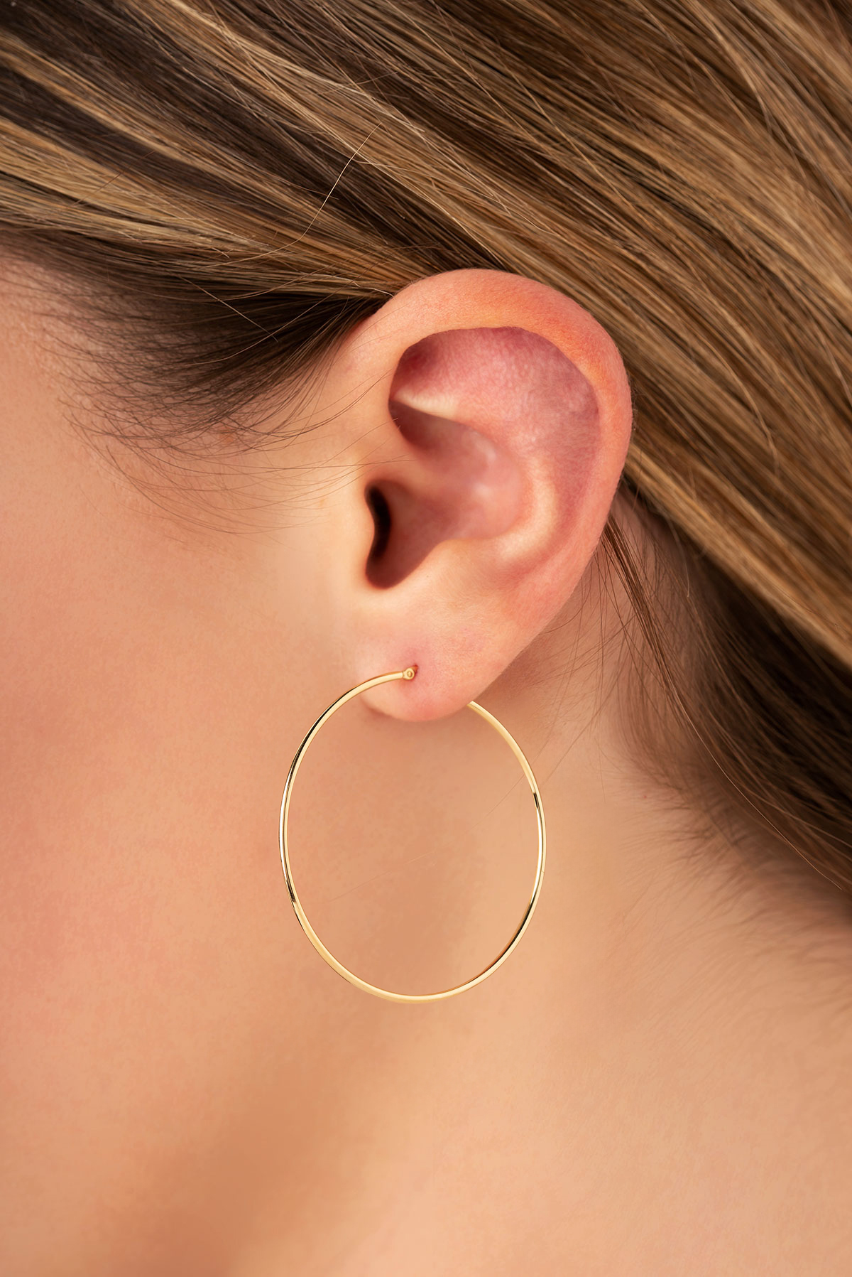 A timeless essential, reimagined in its purest form. These large 40mm hoop earrings are crafted in luminous 14K yellow gold, featuring a sleek, slender tube silhouette that feels weightless yet impactful. The hinge-post closure ensures seamless wear, while the refined proportions lend effortless elegance to any look.