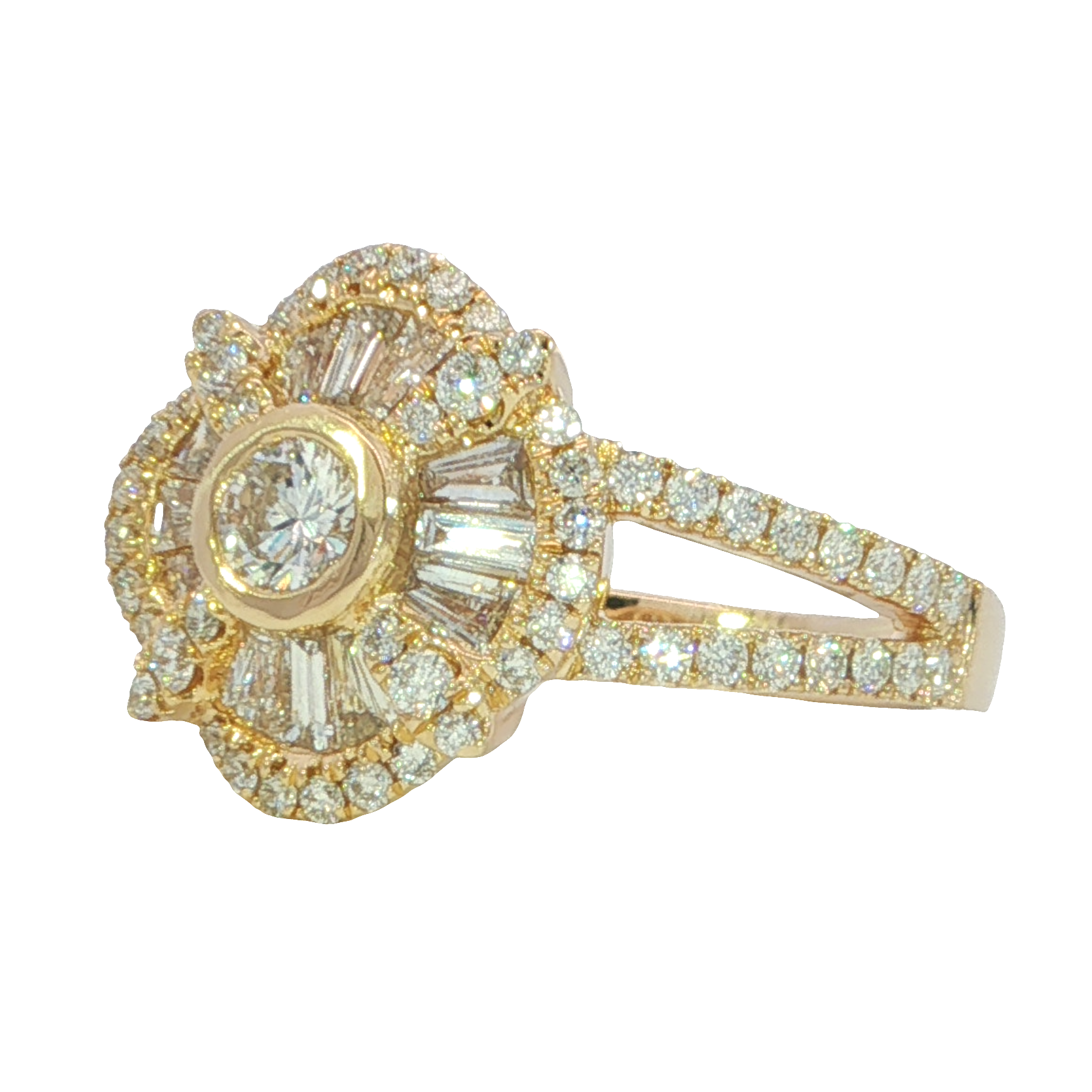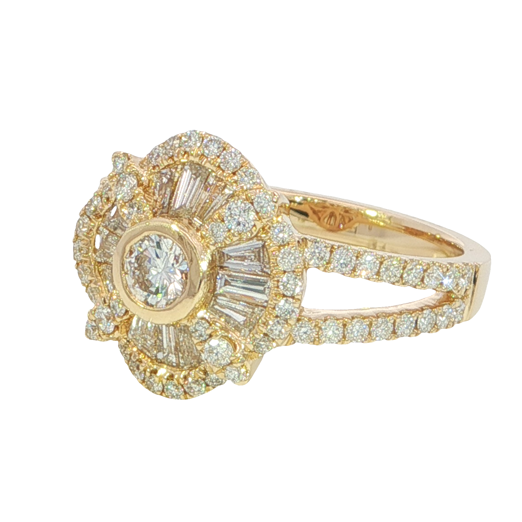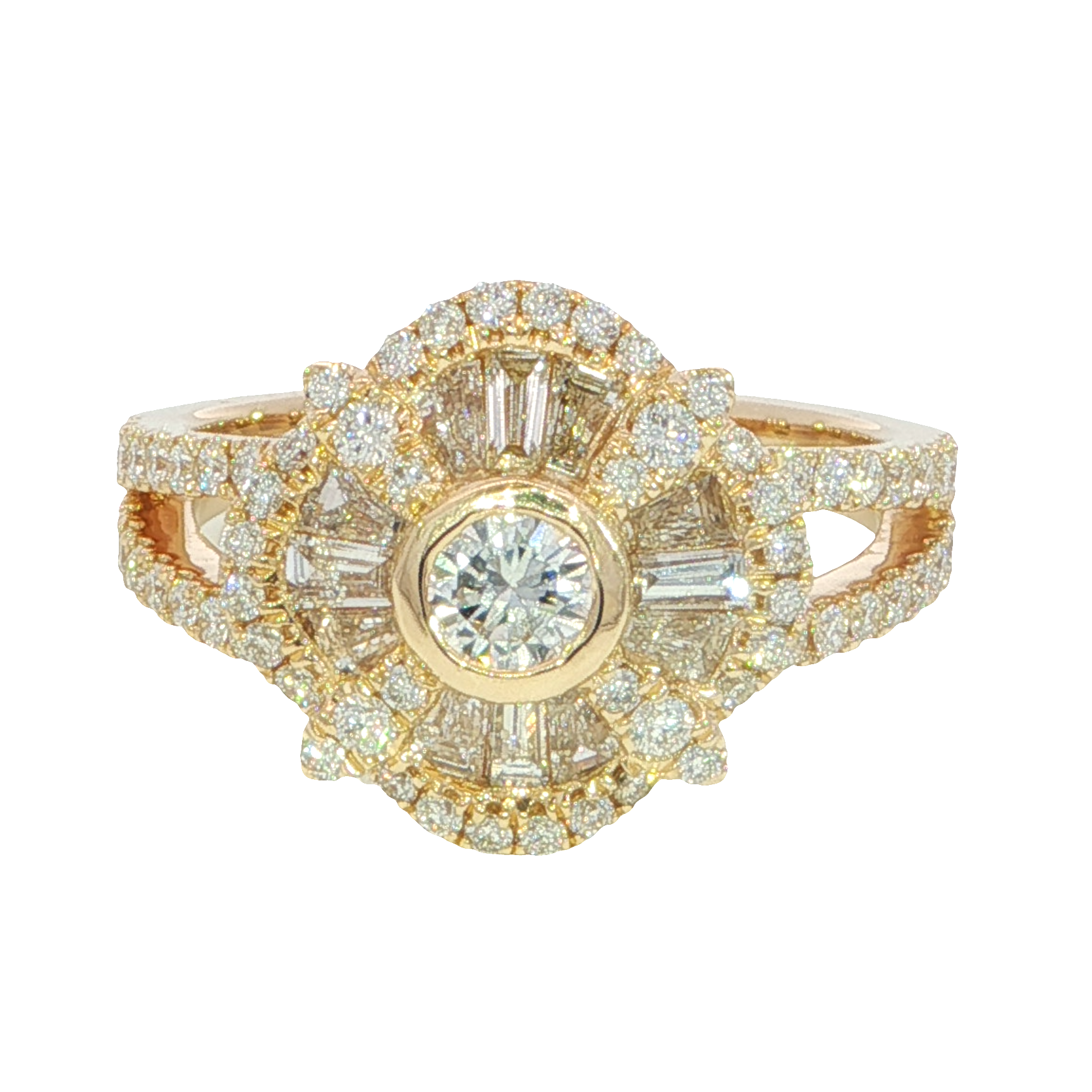 A vintage-style 14k yellow gold ring featuring a .20 carat center diamond surrounded by a mix of round and tapered baguette natural diamonds. The round accent diamonds total .50 carat, and the baguettes total .46 carat — all G color, SI2 clarity — for a combined diamond weight of 1.16 carats. A timeless design with radiant sparkle and classic charm.