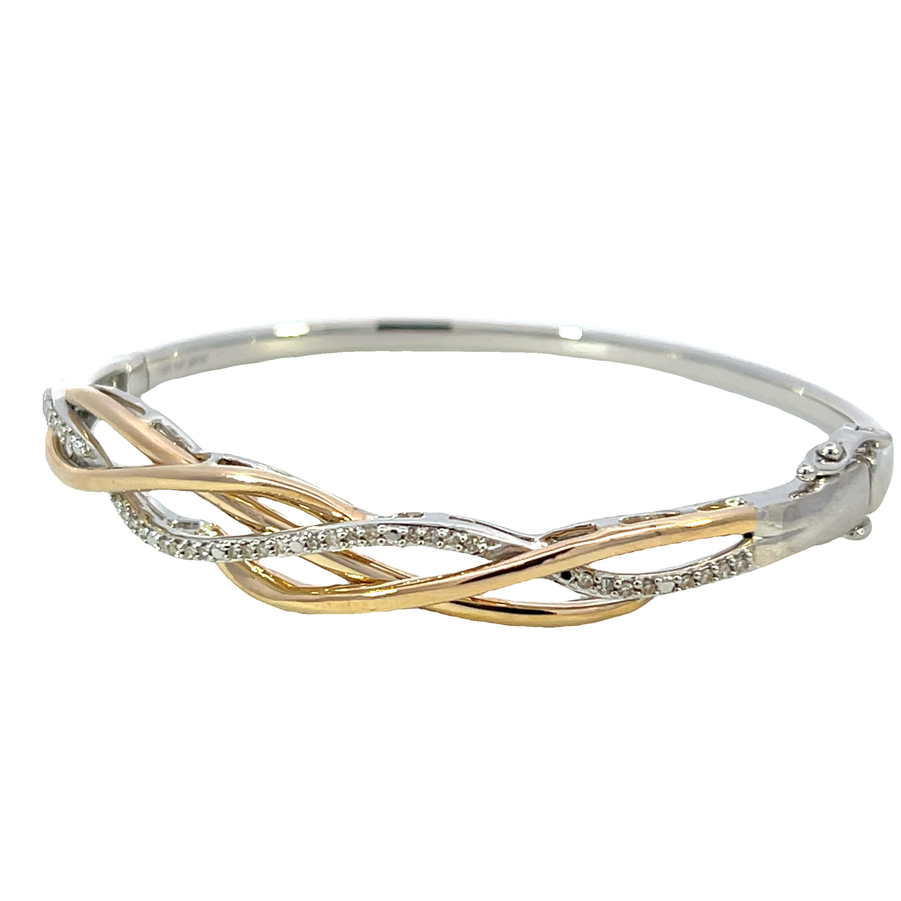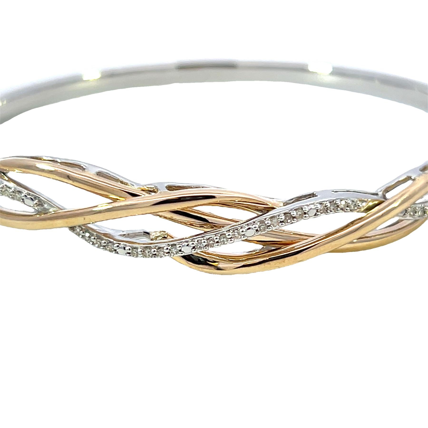 This striking bangle features an elegant criss-cross design of 10k yellow gold and sterling silver, beautifully intertwined. Sparkling round diamonds totaling .20ct accent the piece, adding brilliance to its bold, modern style—a perfect blend of contrast, shine, and sophistication.