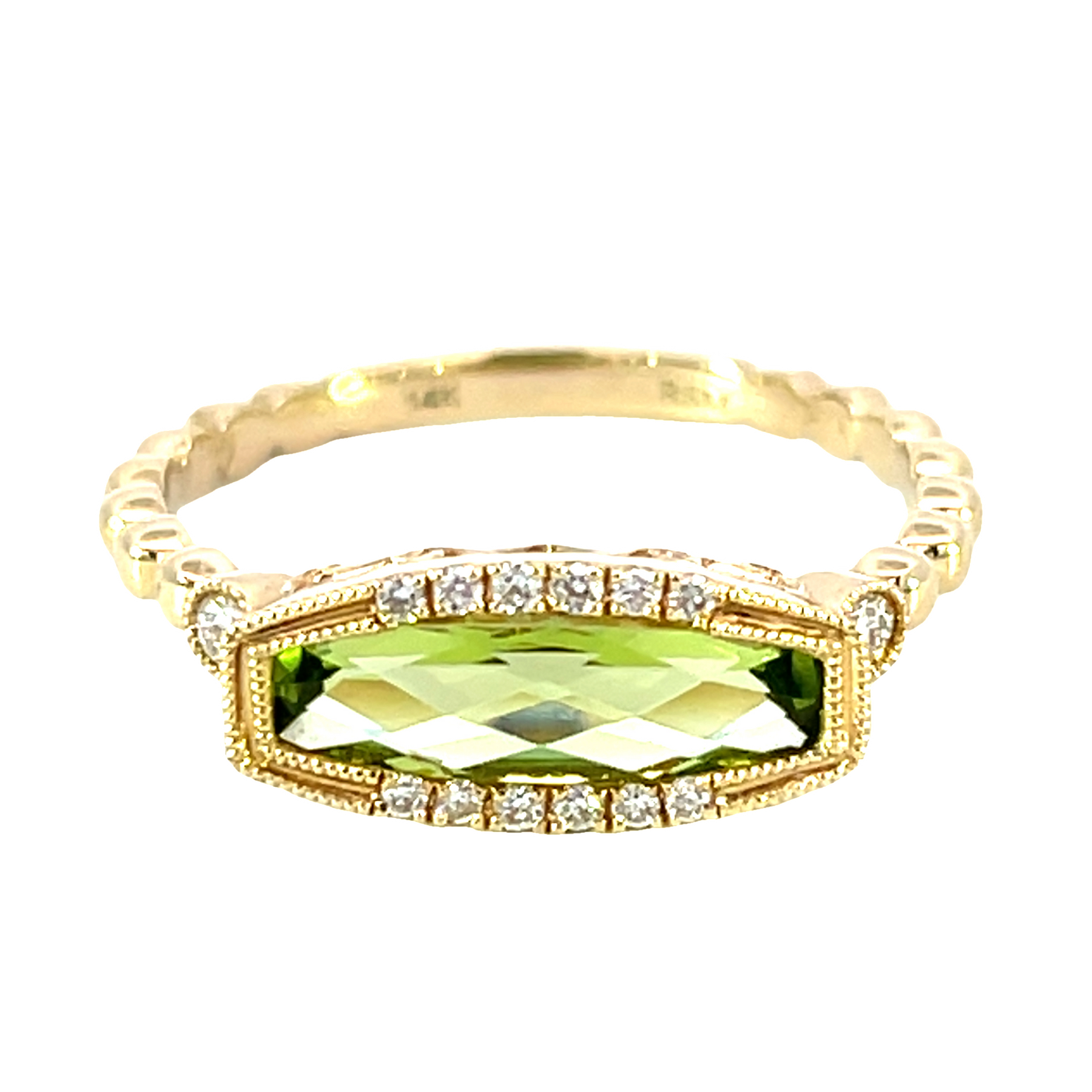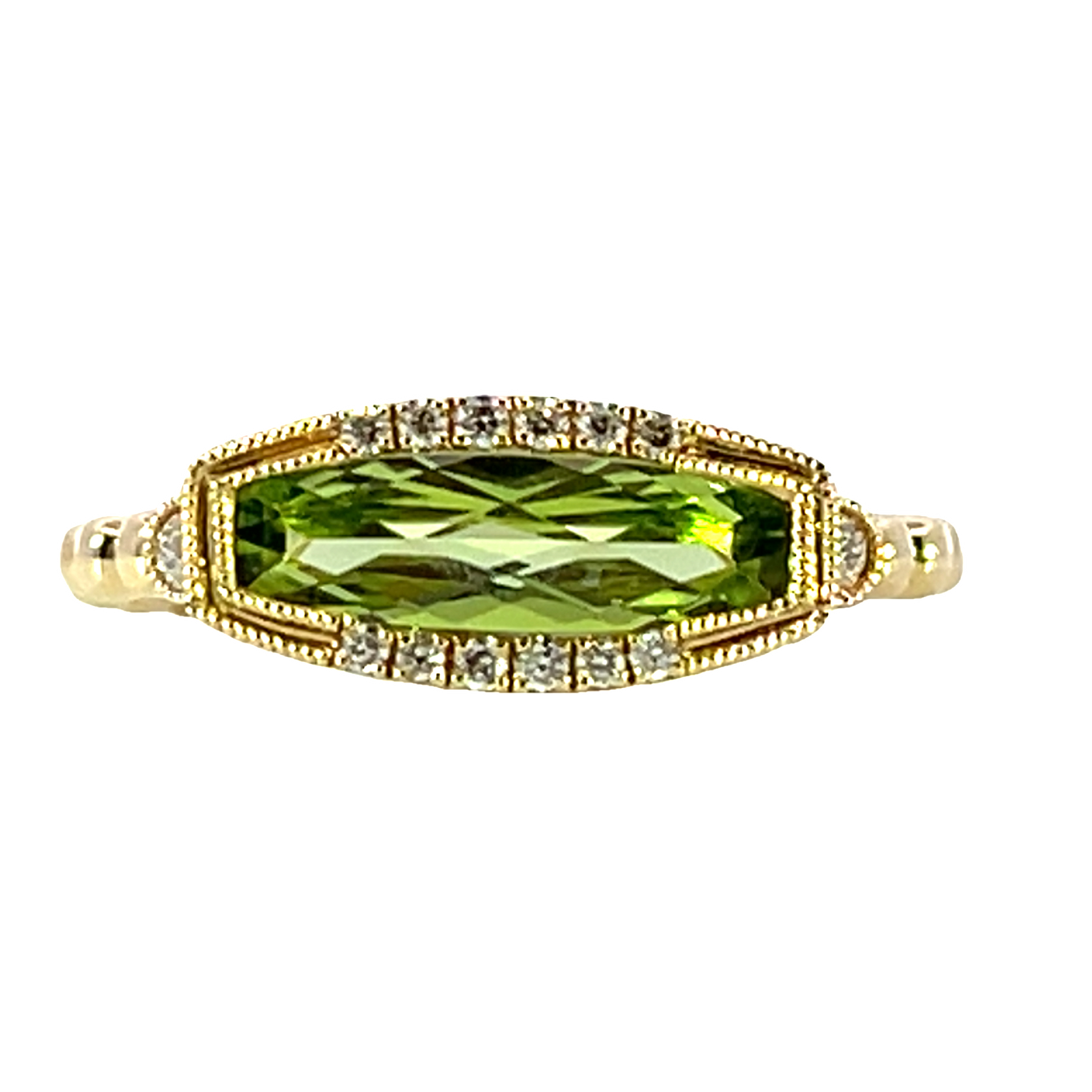 This striking oblong ring features a vivid 1.02ct 12x5mm peridot, framed in a halo of sparkling GH SI2 round diamonds totaling .12ct. Set in rich 14k yellow gold with a beaded band and filigree profile, it blends vintage charm with bold color.