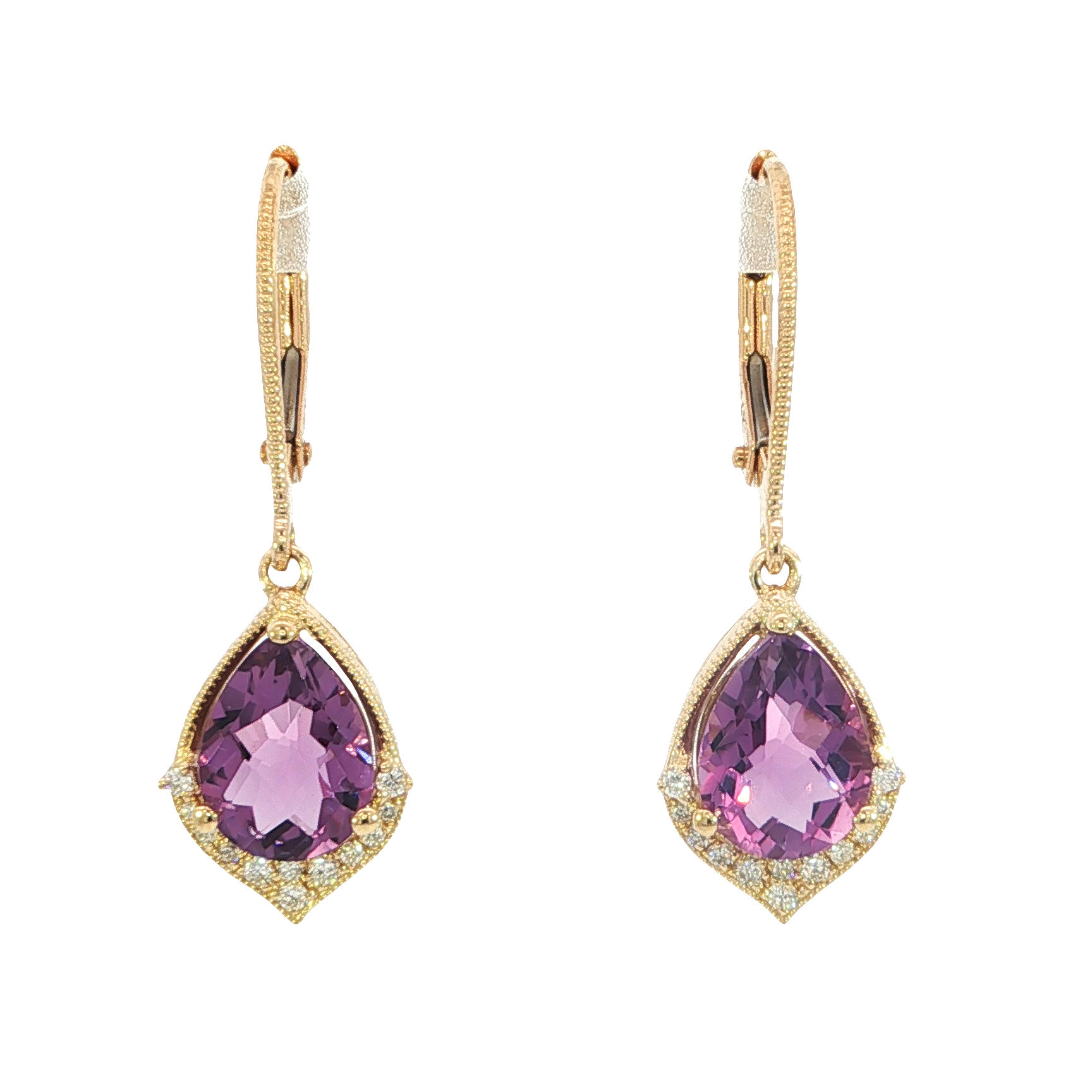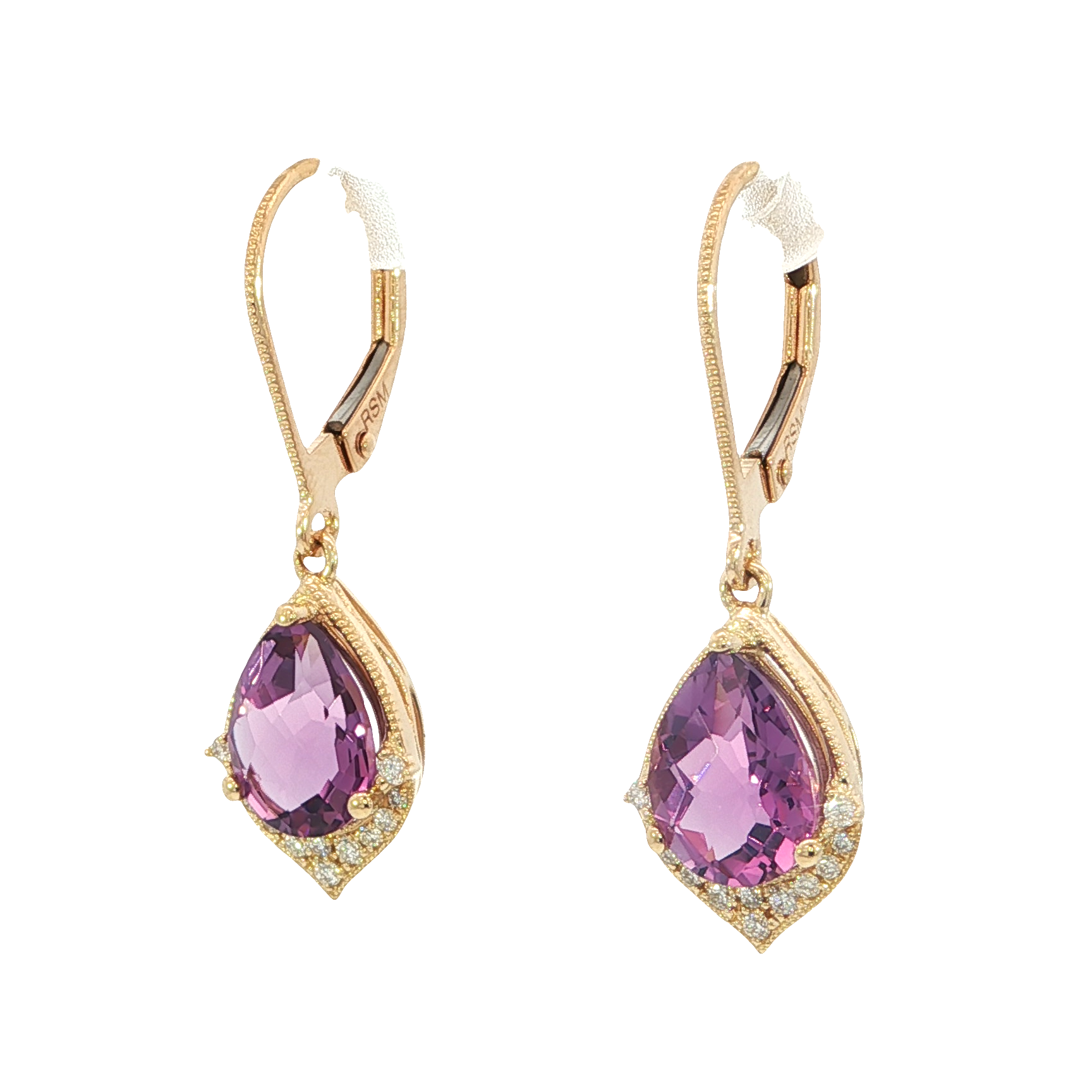 Elegant 14k yellow gold drop earrings featuring 8x6mm amethyst gemstones accented below by round natural diamonds totaling .11ct. Suspended from secure leverbacks, these earrings showcase rich color and refined sparkle in a timeless, graceful design.