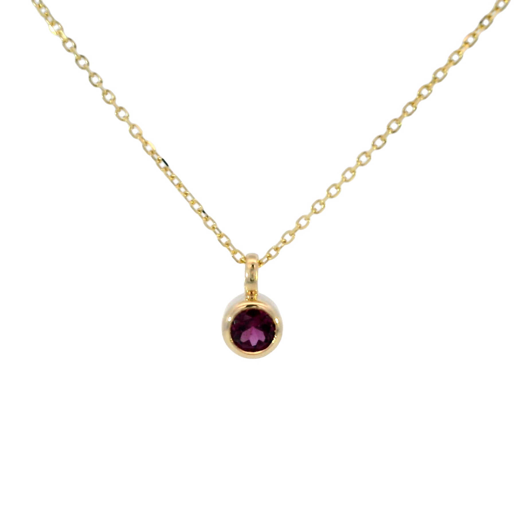 A rich .24ct round rhodolite garnet, representing June’s unique birthstone alternative, is bezel-set in a minimalist 14k yellow gold pendant. Suspended from an adjustable 18-inch chain with a secure lobster clasp, this piece blends deep rose-red color with understated elegance—perfect for layering or thoughtful gifting.