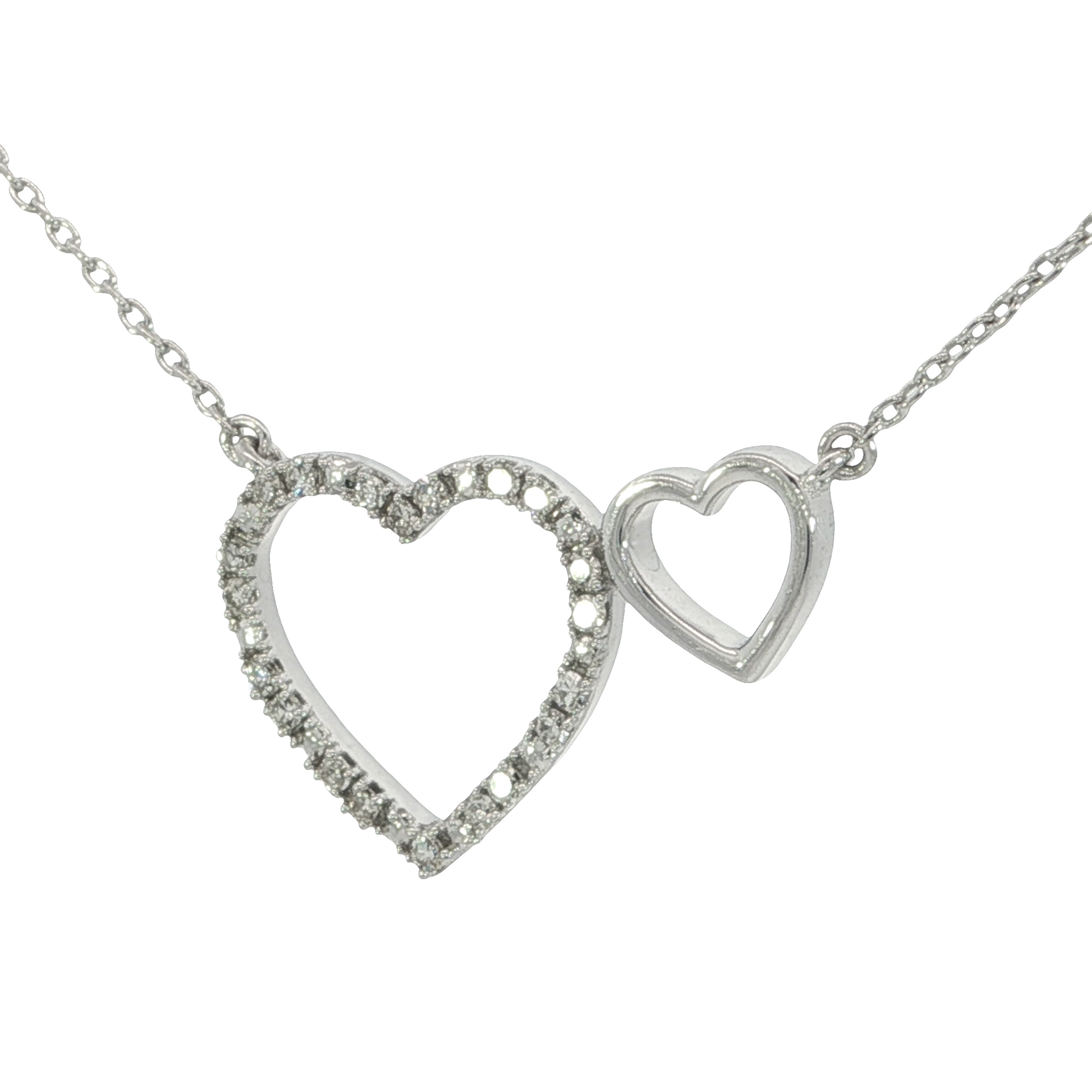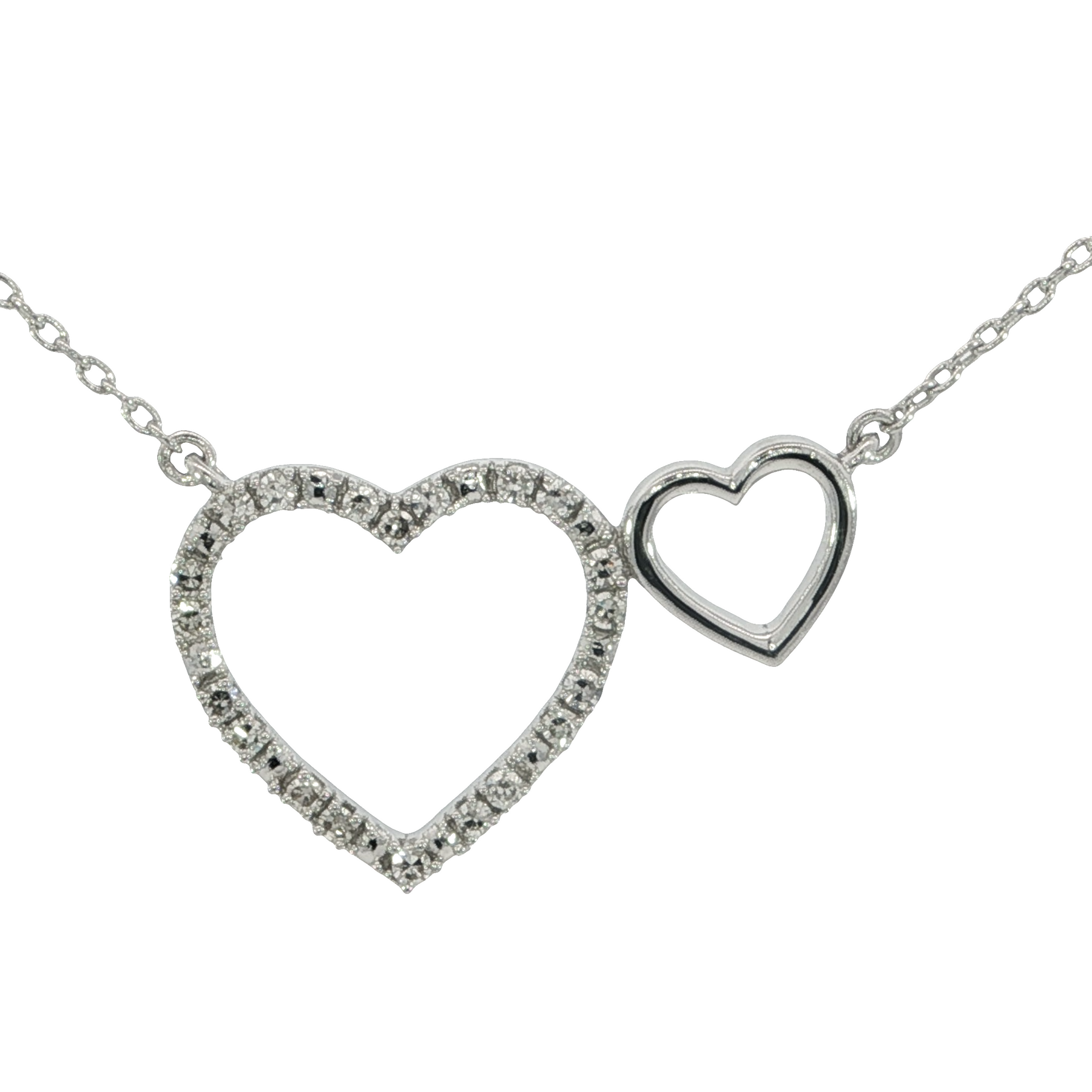 A lovely sterling silver necklace featuring two interlocking open hearts, the larger heart lined with natural diamonds totaling .10ct and the smaller heart finished in high polish. Stationed at the center of an 18 inch cable chain with a secure lobster clasp, this piece beautifully symbolizes love and connection.
