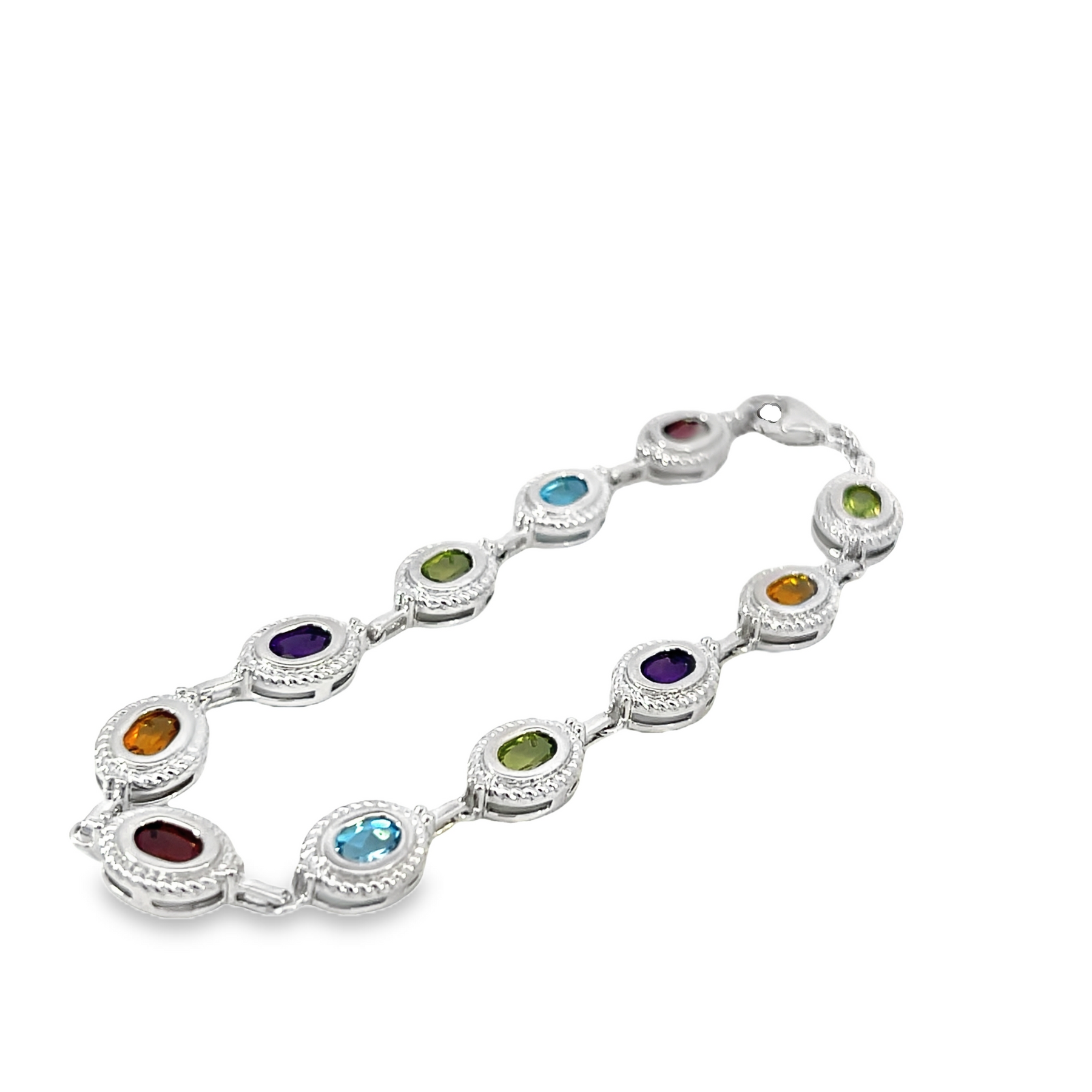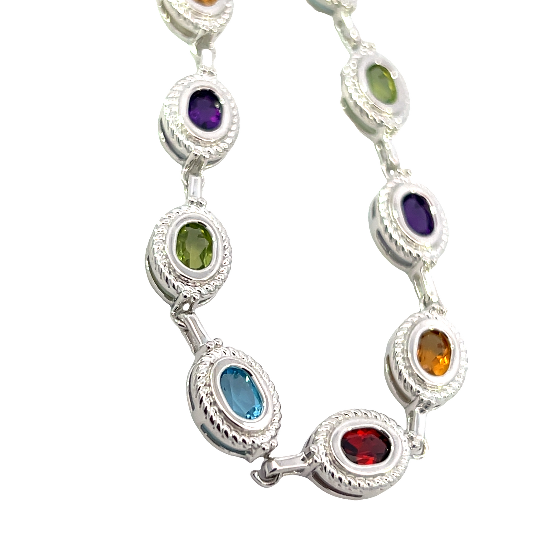 A vibrant celebration of color, this 7-inch bracelet showcases a stunning mix of gemstones—two each of 6x4mm blue topaz, amethyst, garnet, and citrine, along with three 6x4mm peridot. Each stone is nestled in a detailed rope-style bezel, all crafted in sterling silver. A graceful blend of warmth and brilliance, perfect for everyday elegance or a thoughtful gift.