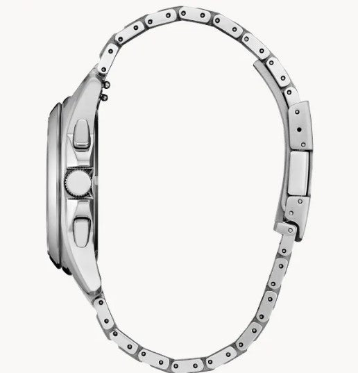 Make a distinctive style statement that's ready for action with this new Sport Luxury chronograph. The 40.5mm silver-tone stainless steel case holds a sunray light blue dial with a 1/5 second chronograph that measures up to 60 minutes, 12/24-hour time, and date. The sleek dial is accented with black registers, and finished with a sapphire crystal. The silver-tone stainless-steel bracelet has a fold over clasp with push buttons, giving the timepiece a secure, understated refinement. This Eco-Drive watch is sustainably powered by any light source, eliminating the need for batteries, and is water resistant up to 100 meters. Caliber B620.