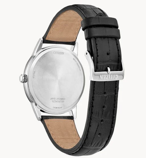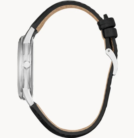 Classic lines and a simple silhouette define the newest addition to the Classic collection. This vintage-inspired timepiece features a silver-tone stainless steel case, a striking blue 3-hand dial with a date function, and a rich black leather strap with buckle closure. Sustainably powered by any light with Eco-Drive technology and never needs a battery.
