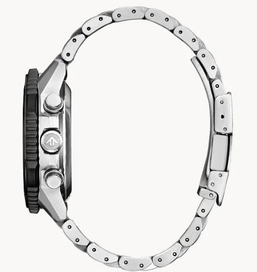 With advanced technology paired with an incredibly bold look, the latest Promaster Air Navihawk reaches a higher altitude in style. The watch's silver-tone stainless steel case measures 40mm in diameter, wearing boldly with its sharp faceting and satin finishing, while a slide-rule scale on the bezel provides additional flight utility. A triple-link stainless steel bracelet secures the timepiece to the wrist.