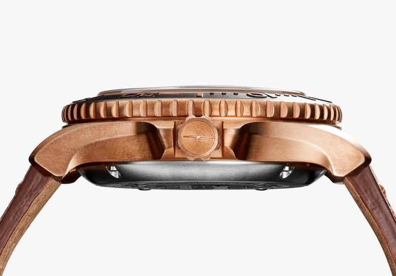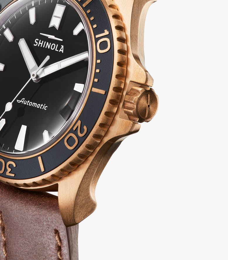 This Shinola Monster stands out with its 43mm bronze case and a brushed finish. The caseback is crafted from stainless steel and features a matte black plate. Bronze is known to tarnish, creating a rich patina over time and use for a look that’s truly yours. Set inside the unidirectional bezel, the sapphire crystal has an anti-reflective coating to ensure maximum visibility.