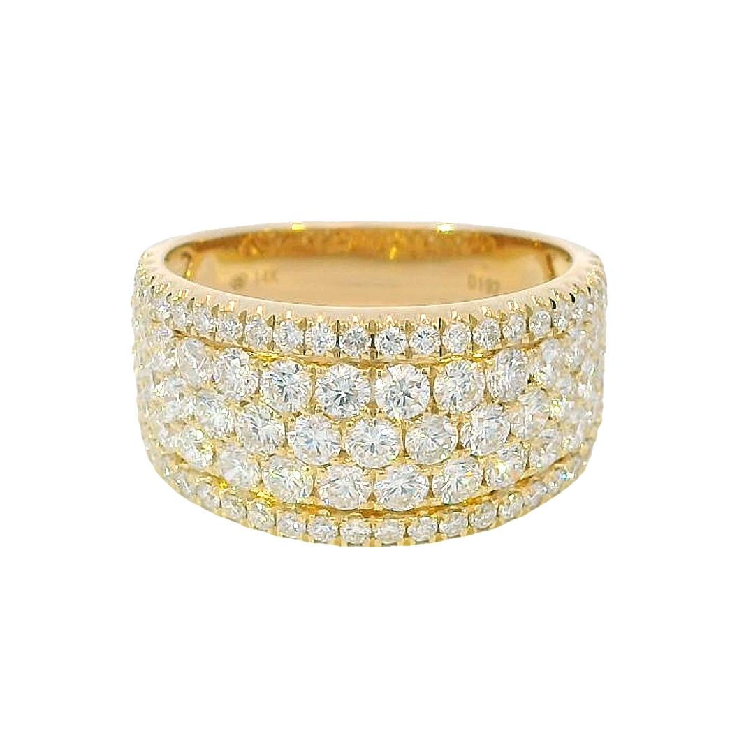 This ring is the ultimate show stopper. It's 5 Rows of glistening natural diamonds are a beacon of beauty. The 3 central rows promote large round accenting diamonds that perfectly contrast with the smaller diamonds in the outer borders of this ring, All .87ct is set in 14k yellow gold.