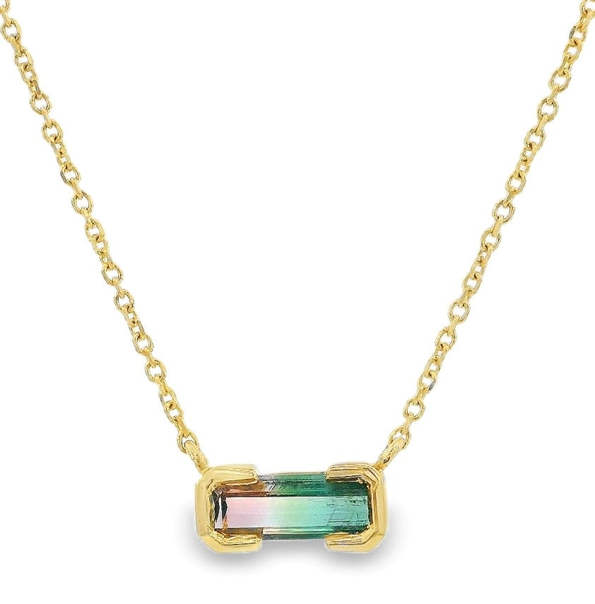 14k Yellow Gold Emerald Cut Watermelon Tourmaline Single Gemstone Necklace