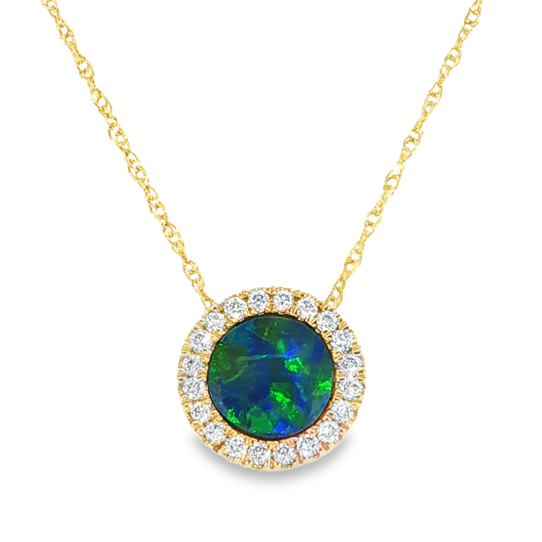 Glowing with shifting hues, a round Australian opal doublet takes center stage, embraced by a halo of brilliant round diamonds totaling .12ct (H-I color, SI2 clarity). Suspended from an 18-inch 14k yellow gold chain, this pendant captures a luminous elegance that feels both timeless and enchanting.