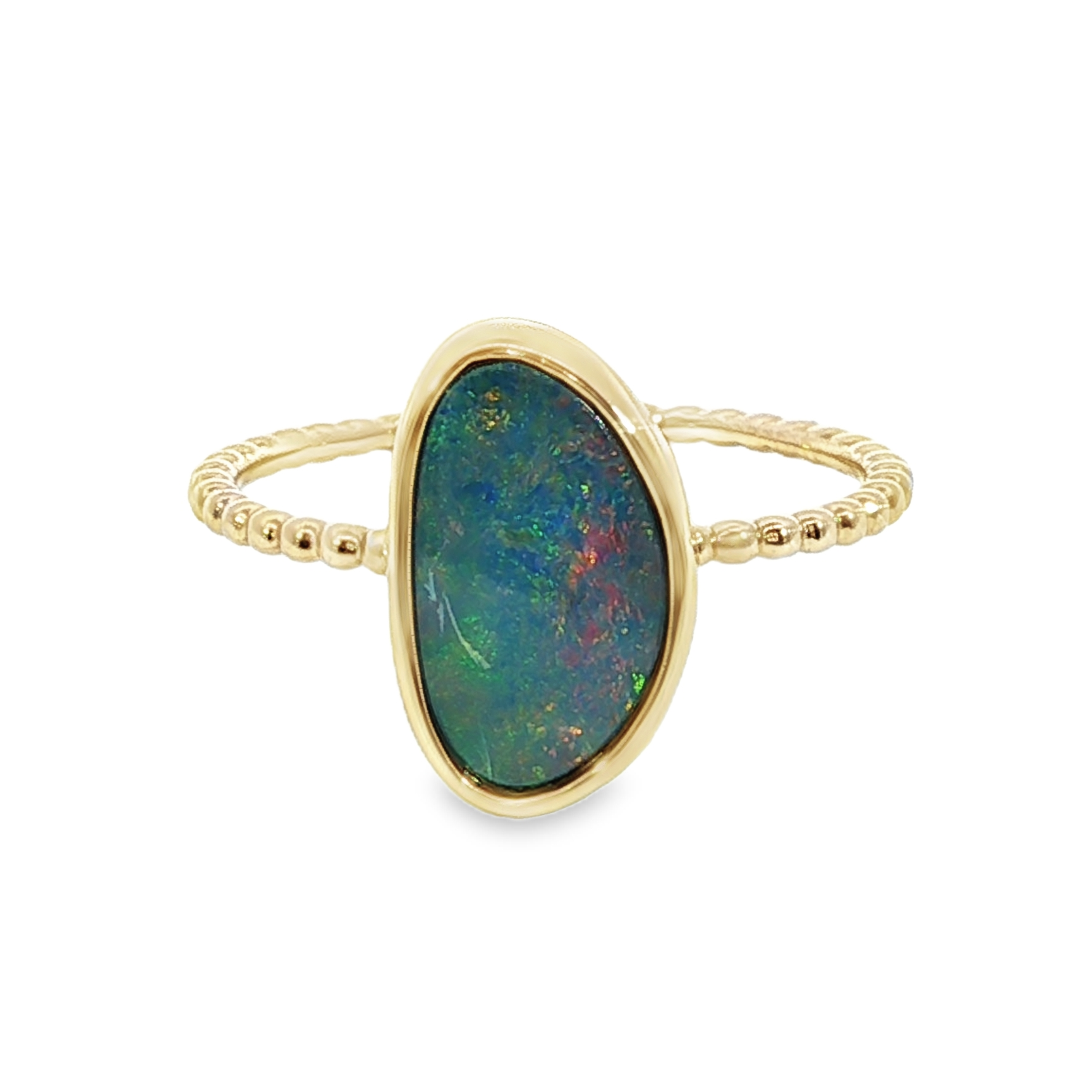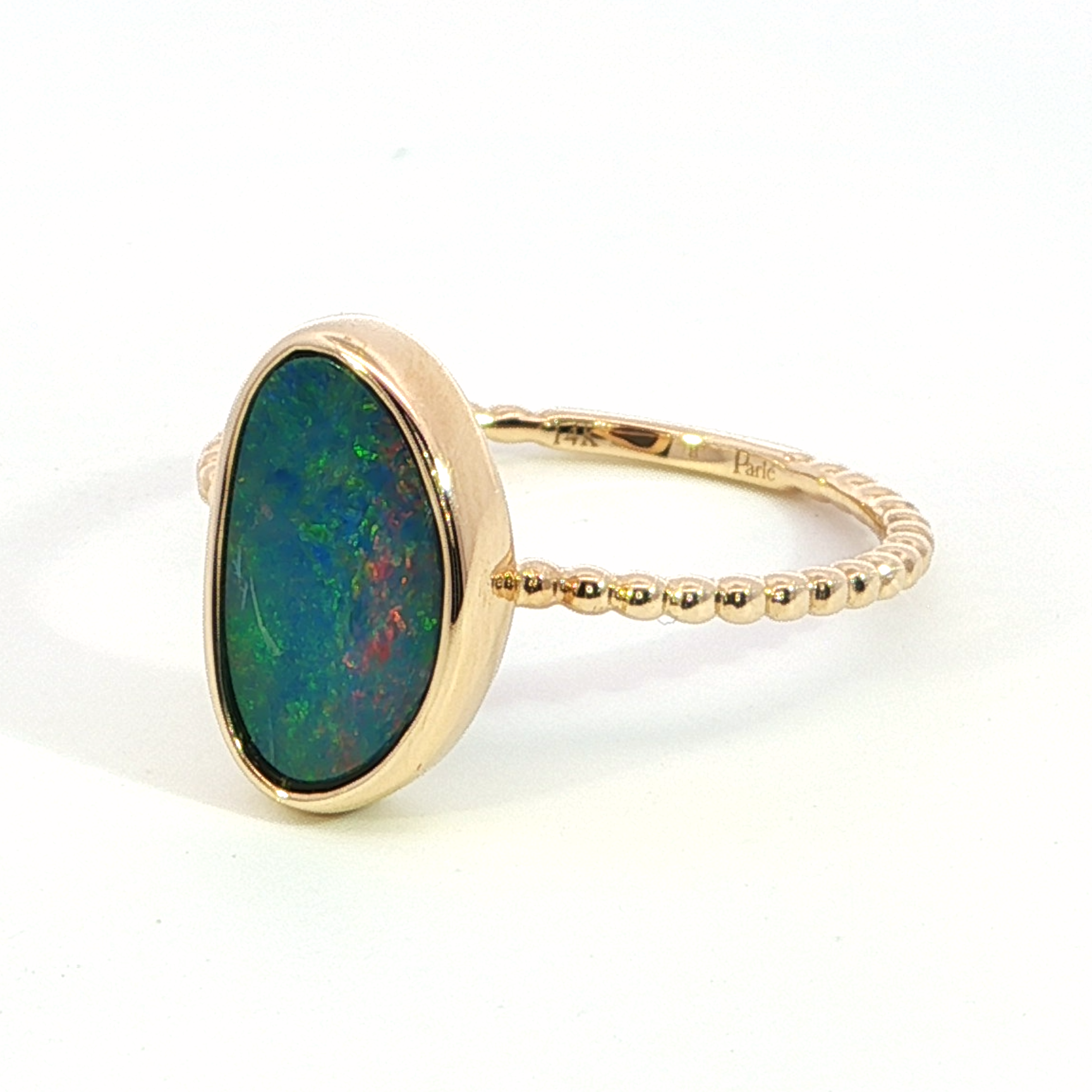 A luminous Australian opal doublet takes center stage in this elegant bezel setting, its vibrant play of color framed in warm 14k yellow gold. The band features delicate beaded detailing, adding a touch of texture and vintage charm to this timeless, artisan-inspired design.