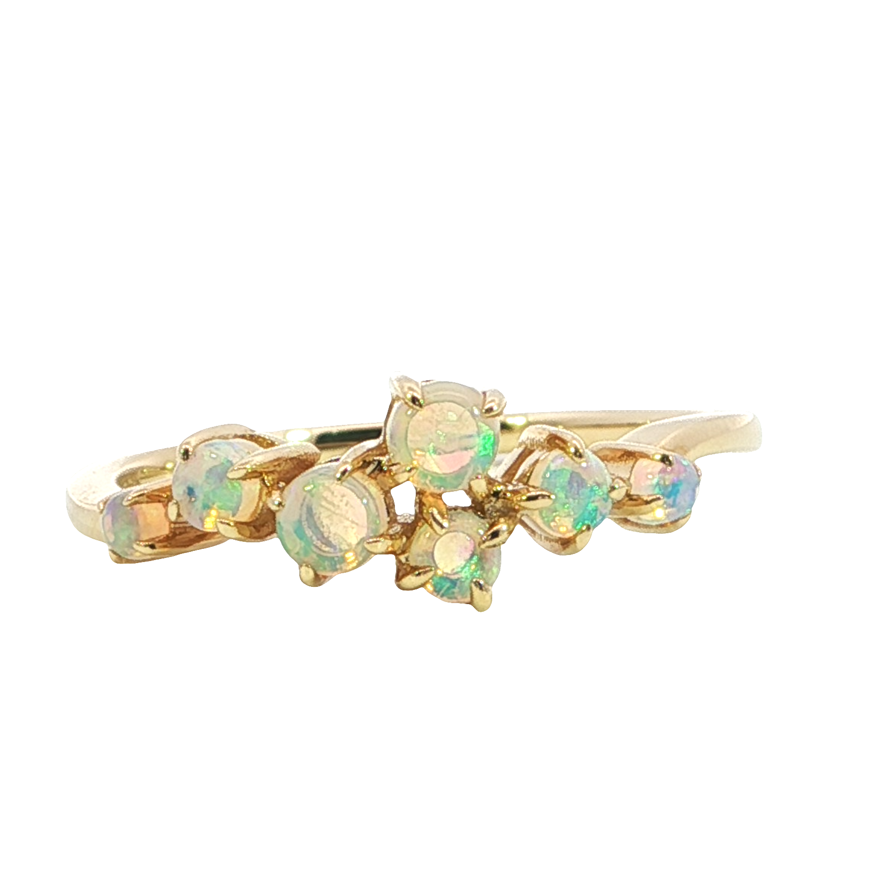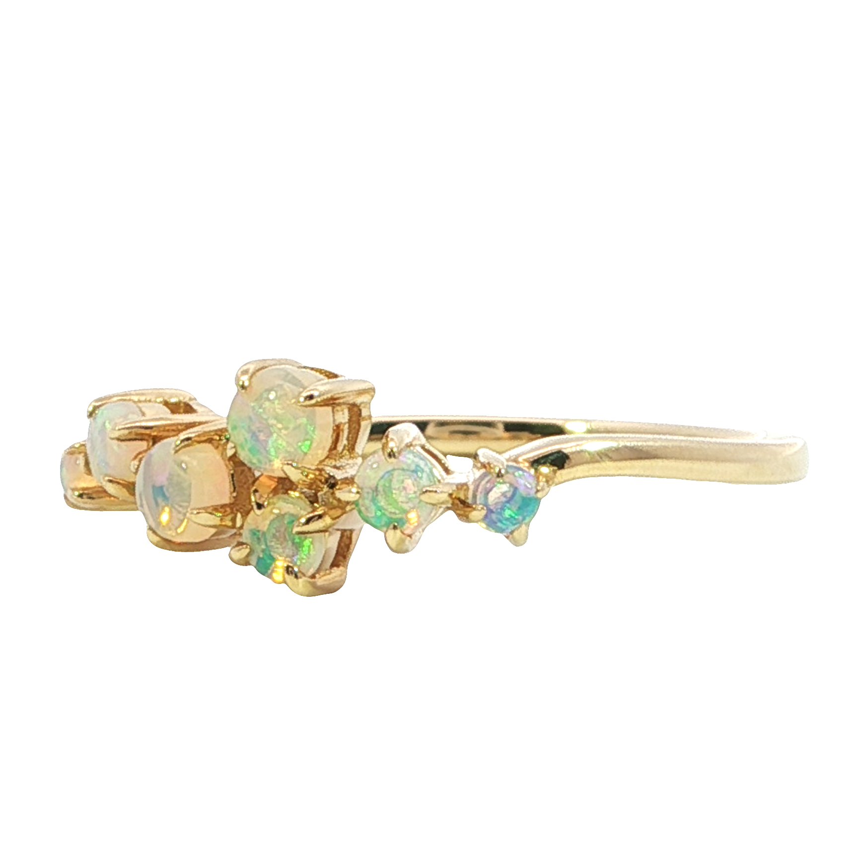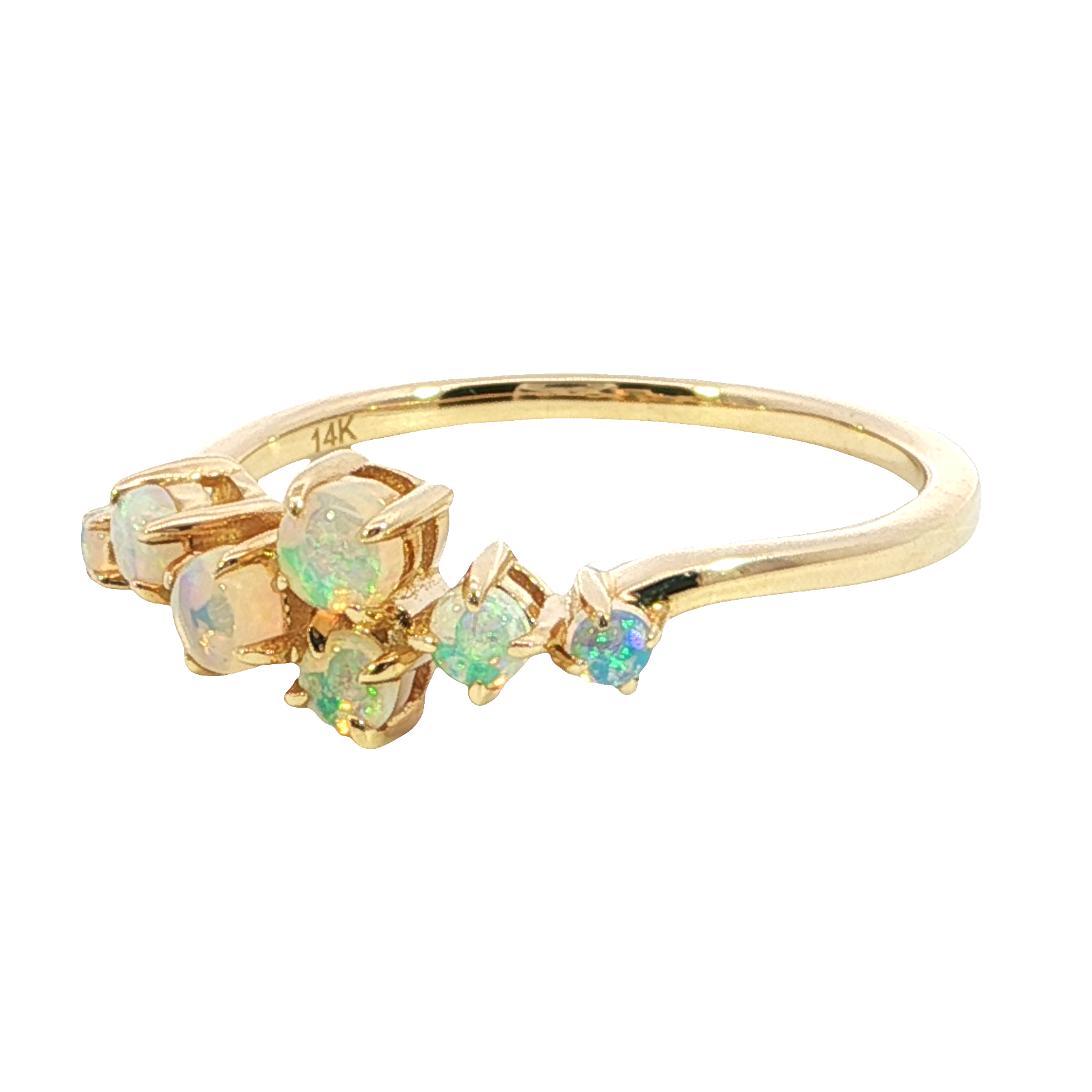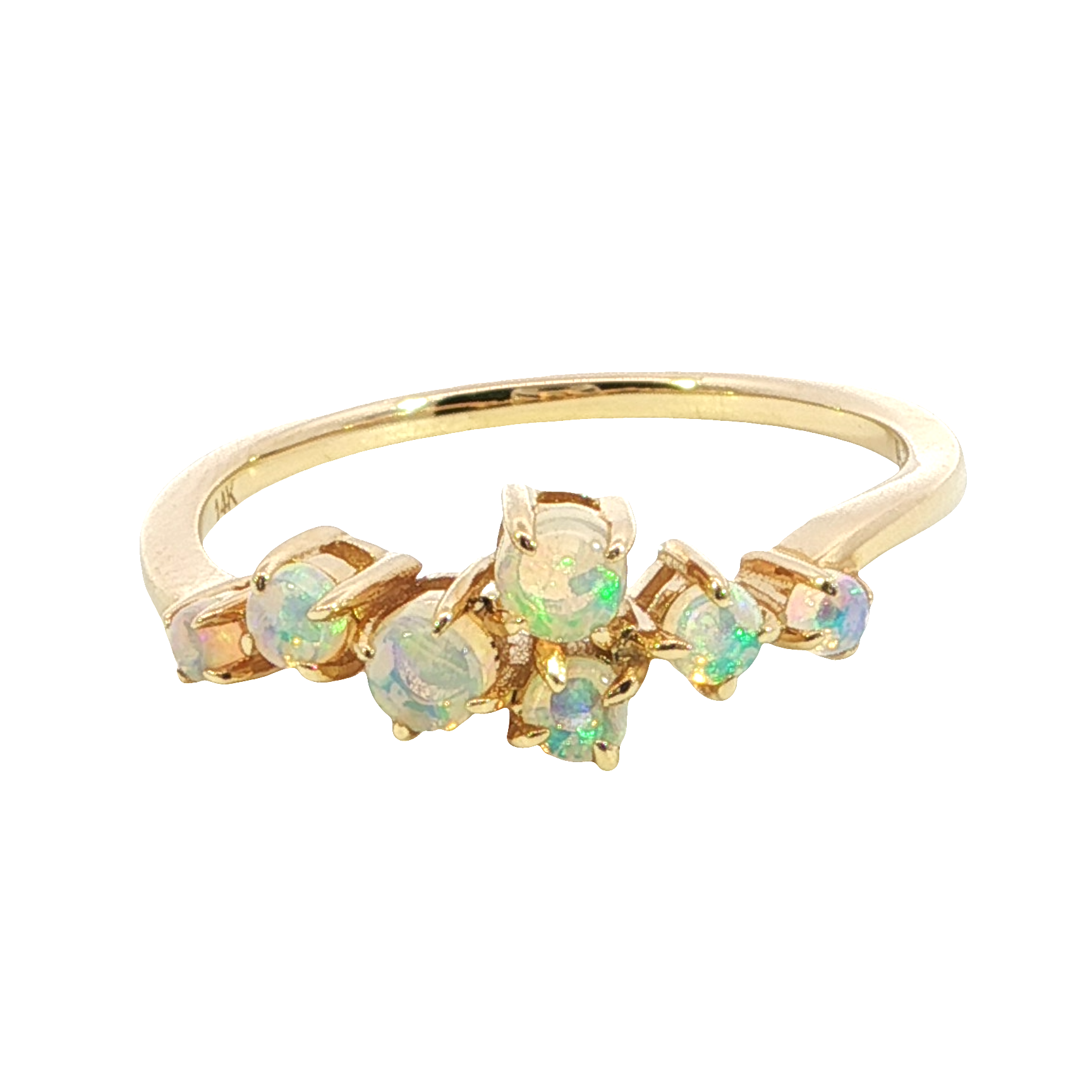 A playful cluster of natural Australian opals—totaling .30ct—bubbles across the band in soft, iridescent hues. Set in warm 14k yellow gold, this ring captures the dreamy shimmer of light dancing on water.