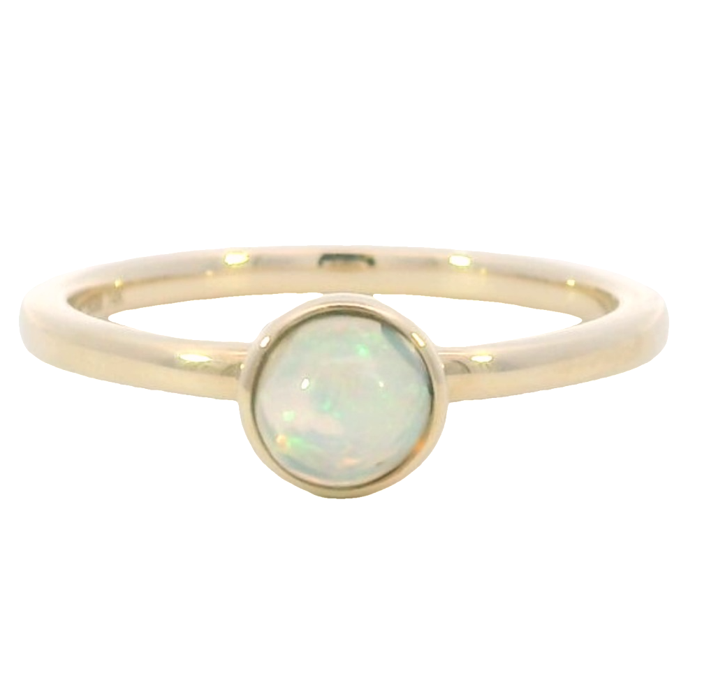 A luminous .28ct round opal, October’s enchanting birthstone, is bezel-set in warm 14k yellow gold. With its ethereal play-of-color and slender, stackable design, this ring captures the magic of individuality and timeless elegance.