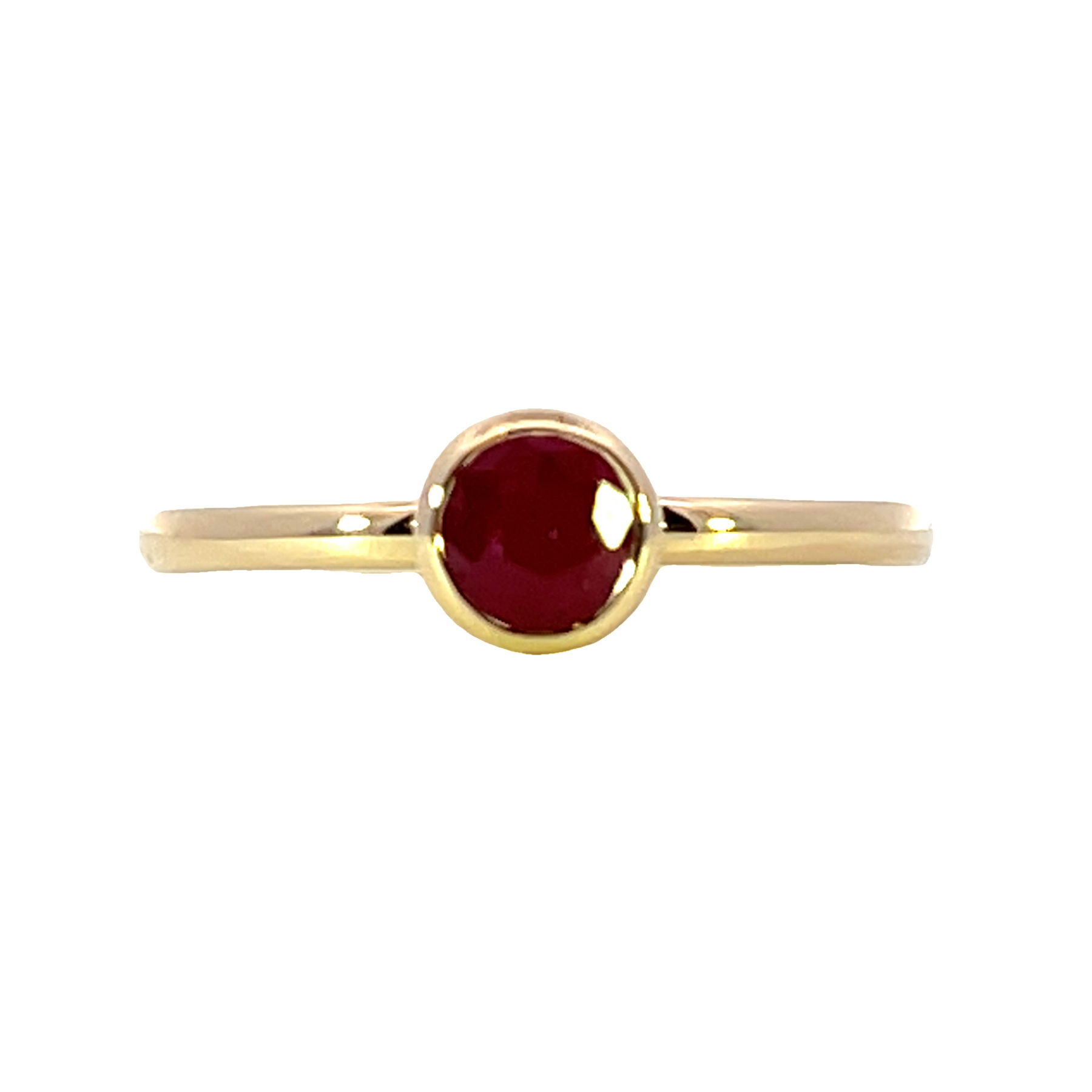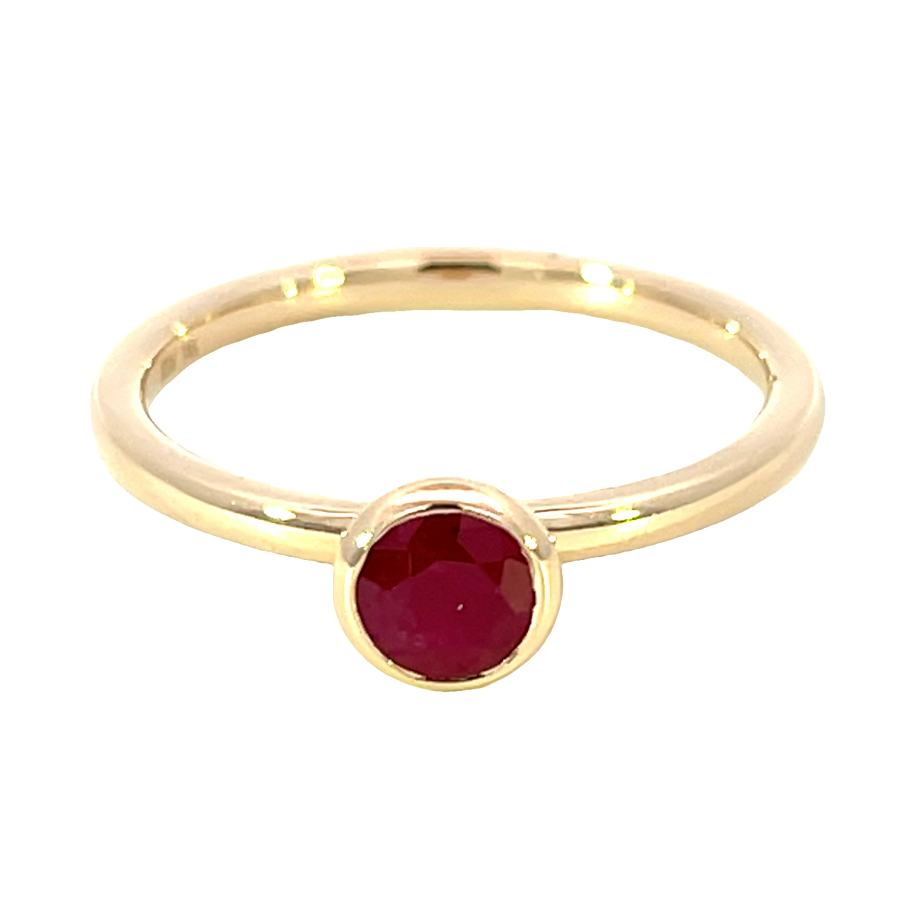 A vibrant .61ct round ruby, the birthstone of July, is bezel-set in glowing 14k yellow gold. Designed in a slender, stackable style, this ring brings rich color and timeless elegance to any jewelry collection.