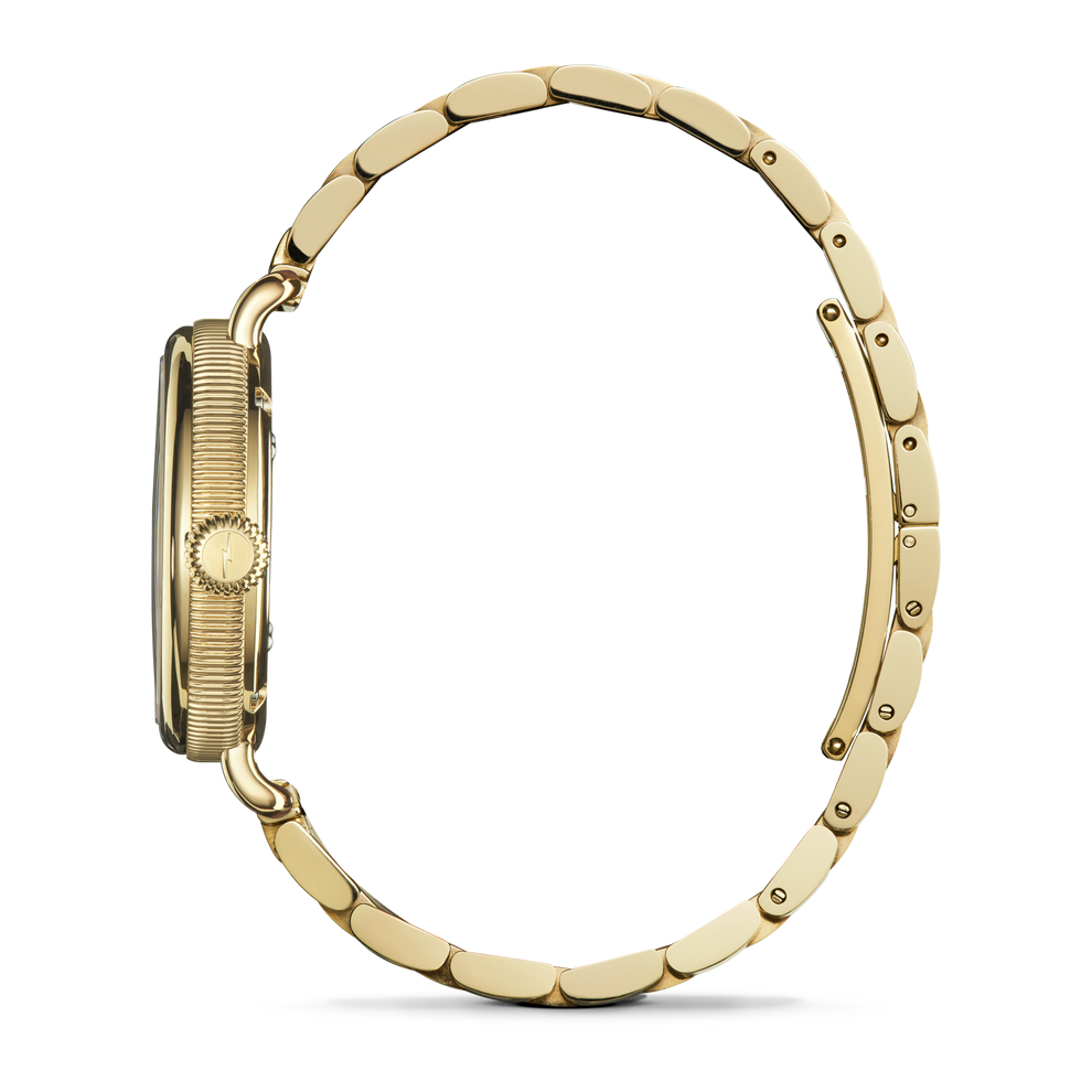 The Petoskey stone is treasure sought out by many who visit the beaches of northern Michigan. Varied on the surface, each stone is fossil of colonial coral believed to have lived in waters more than 350 million years ago. This 34mm Birdy features gold PVD case and bracelet and dial crafted from polished Petoskey stone which shines in Its unique beauty. Enjoy timepiece that's beautifuland has story to tell. Note: Petoskey stone can vary in pattern and color. No two are the same.