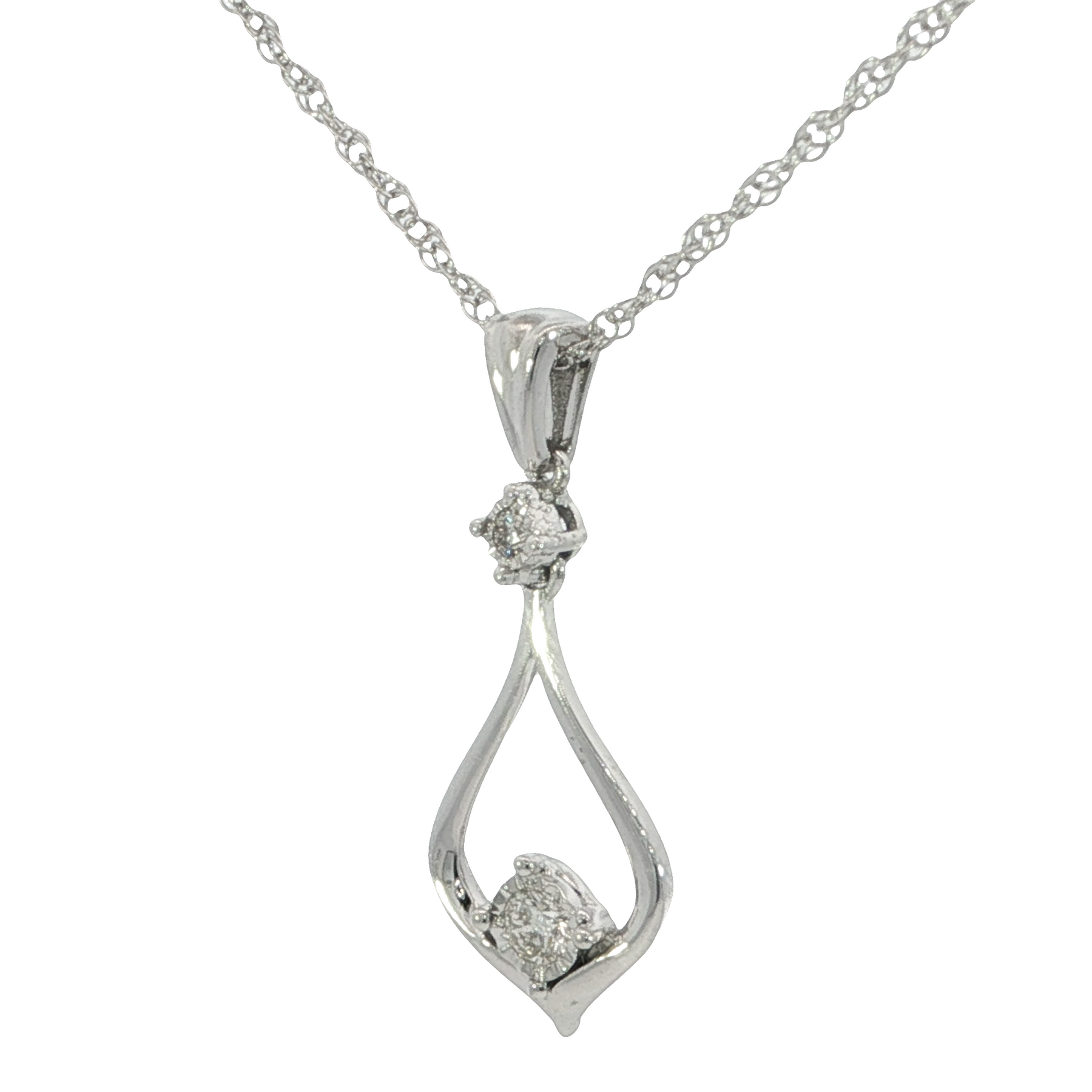 A modern sterling silver open pointed pendant featuring a round natural diamond set at the bottom and another in the bale, with a combined total diamond weight of .10ct. Suspended from an 18 inch rope chain with a secure spring ring clasp, this design offers sleek lines and subtle sparkle for everyday elegance.