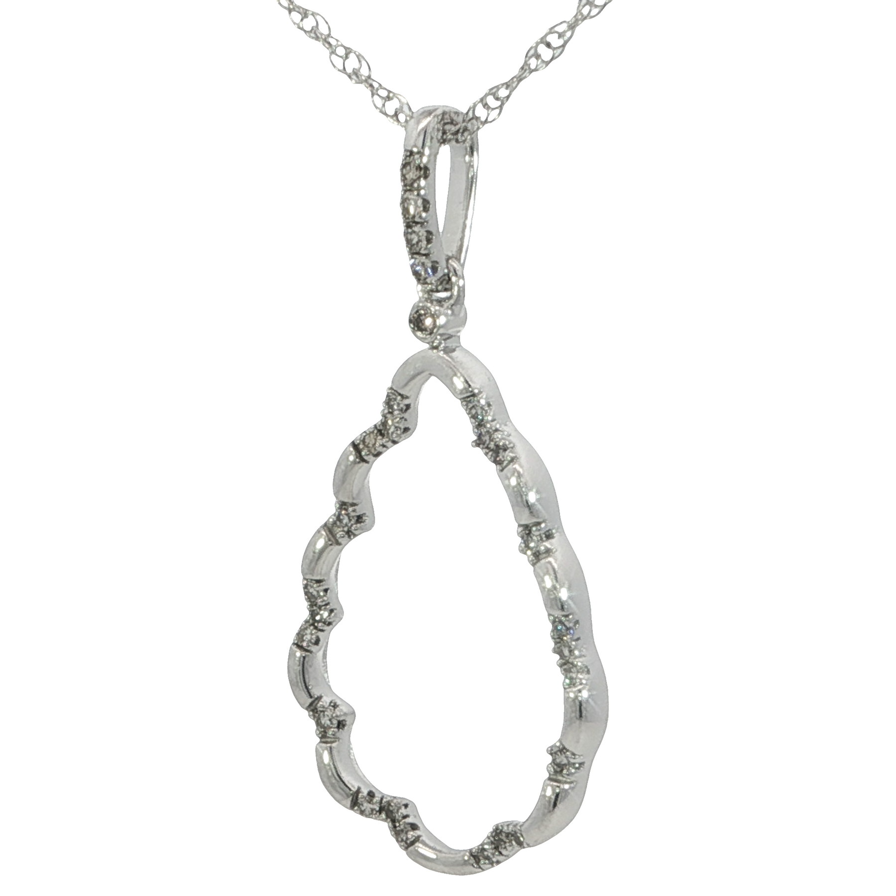 An elegant open teardrop pendant with a delicate scalloped design accented by round natural diamonds totaling .16ct. Suspended from an 18 inch rope chain with a secure spring ring clasp, this piece combines graceful curves and refined sparkle in a timeless style.