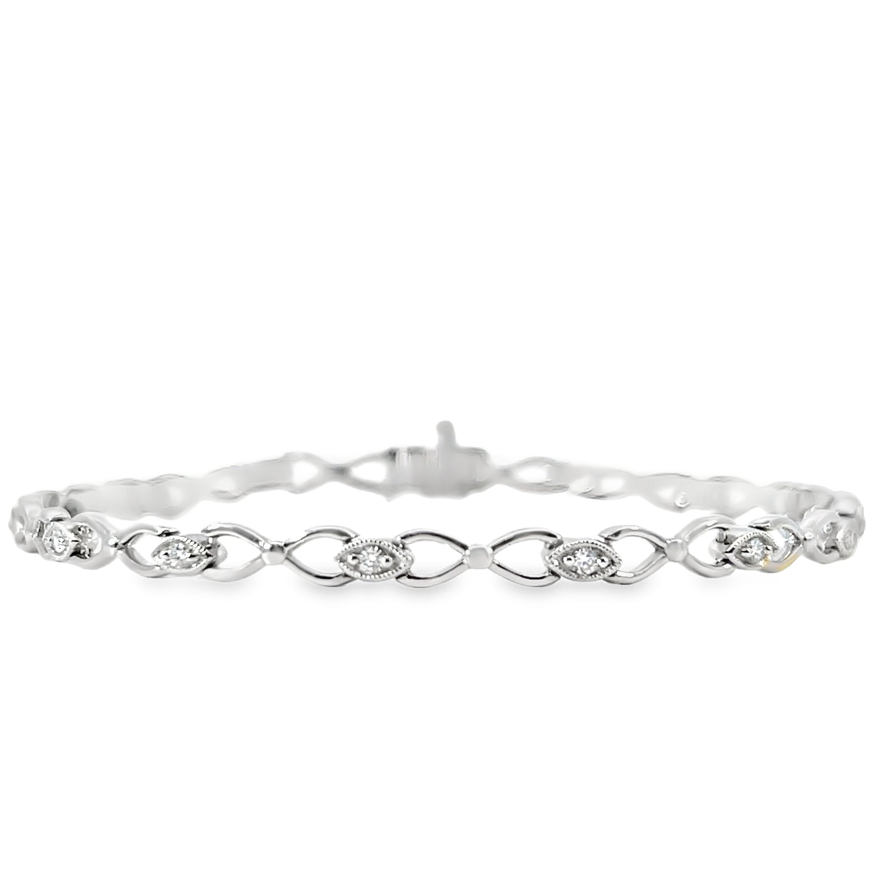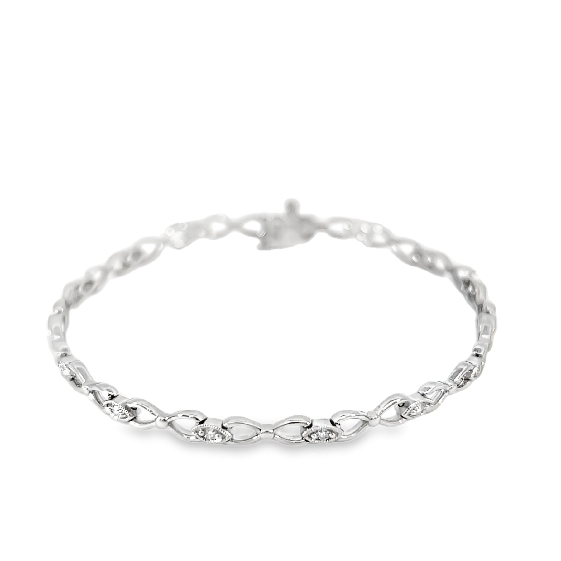 A graceful sterling silver bracelet featuring open curved links alternating with mini infinity links, each adorned with a round natural diamond at the center. Measuring 7.25 inches and secured with a clasp and safety catch, this bracelet symbolizes everlasting beauty with refined sparkle and timeless design.