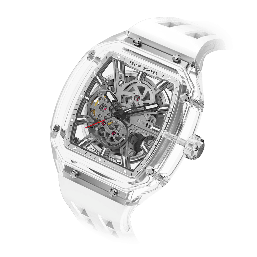 Tsar Bomba's Light Matter Sapphire Crystal Edition Automatic Watch with a full sapphire crystal bezel and faceplate with Chronite case and caseback, Luminous Grade A Hands, 45(W)x51(H)x14.3(T)