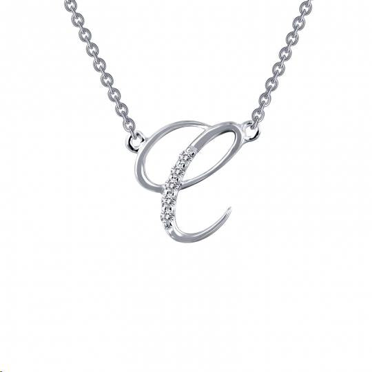Cubic Zirconia Round Initial C Chain Attached Necklace in Sterling Silver