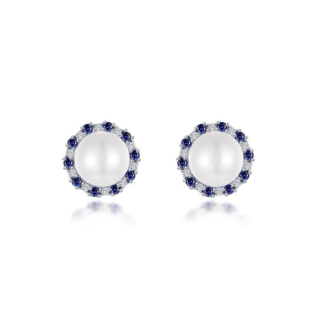 Freshwater Pearl Post Lab Grown Sapphire & CZ Halo Earrings 8-0-8.5mm