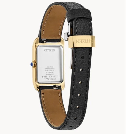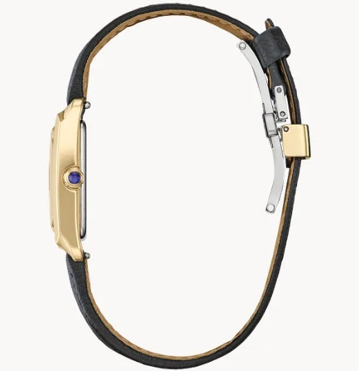 Classic lines and subtle sophistication make this latest piece to our women's collection, the Citizen L Bianca, a charming addition of sustainable luxury. With a design inspired and celebrating feminine motifs in art deco, the distinctive gold-tone stainless steel case features a subtle synthetic sapphire on its crown for a captivating look. A curved rectangular shape defines the watch’s 32.4mm silhouette, with a black leather strap rounding out the look.