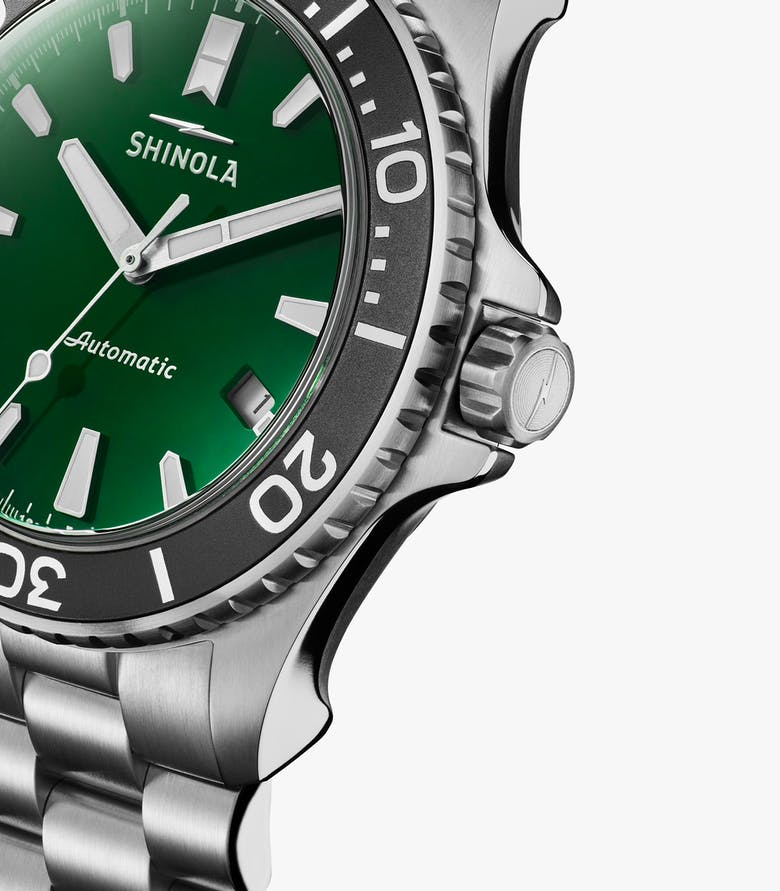 This Shinola Monster is always ready for an adventure. The stainless steel three-link bracelet adds refined style, and a micro-adjustable clasp allows for easy lengthening to ensure the perfect fit for underwater exploration.