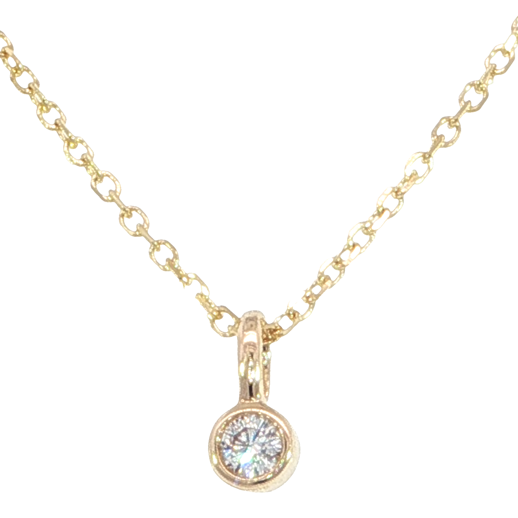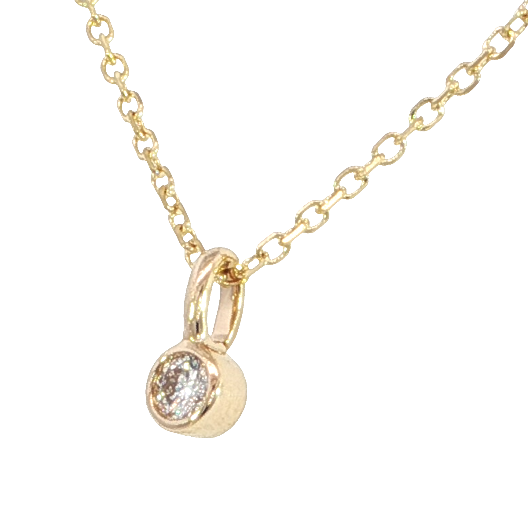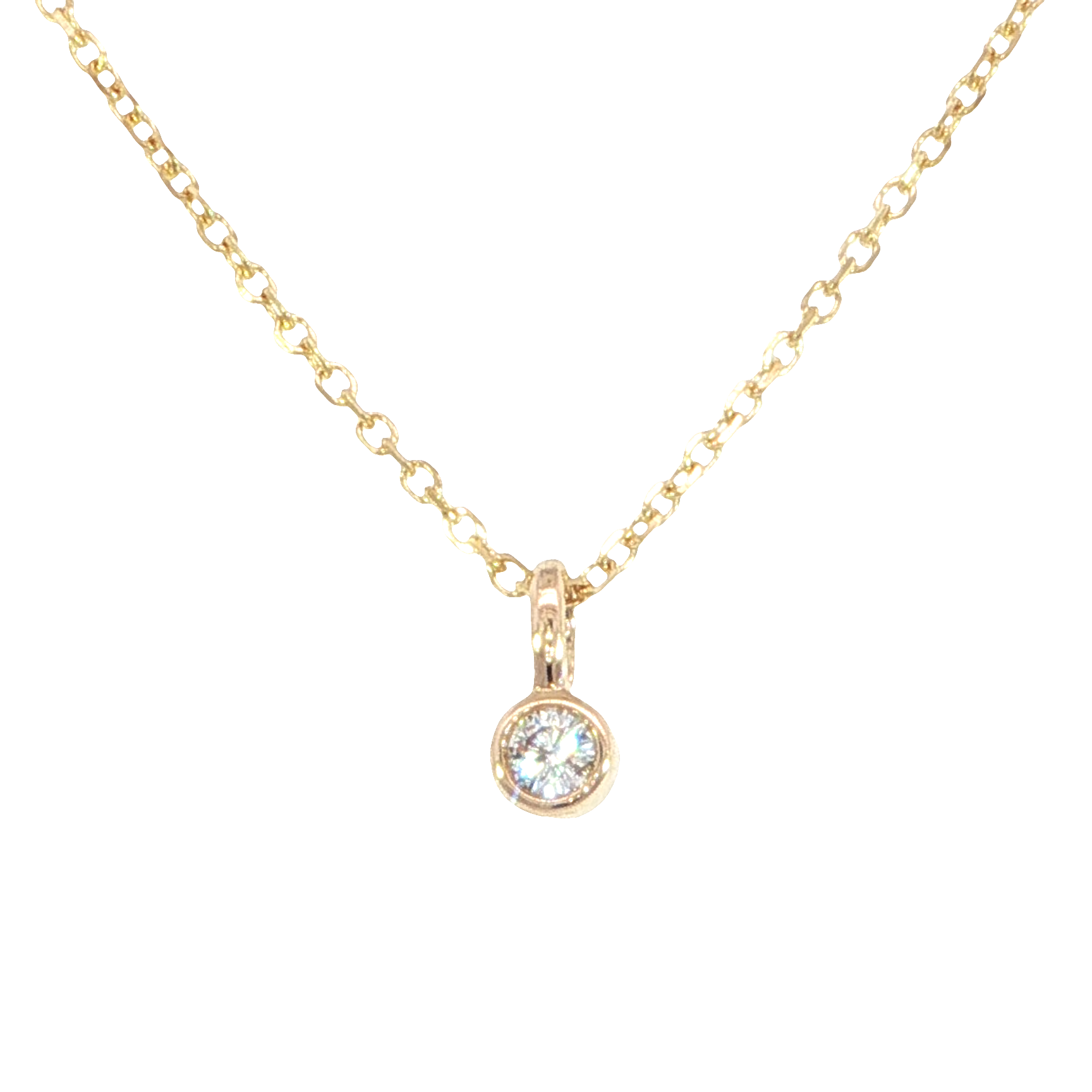 This Bezel Style mini pendant features a natural .03 carat diamond of G color and SI2 clarity, set in warm 14K yellow gold bezel, with an outer diameter measuring 2.98mm. The diamond rests on an 18-inch cable chain with a secure lobster clasp and adjustable length, offering a subtle shimmer that’s perfect for everyday wear or elegant layering.