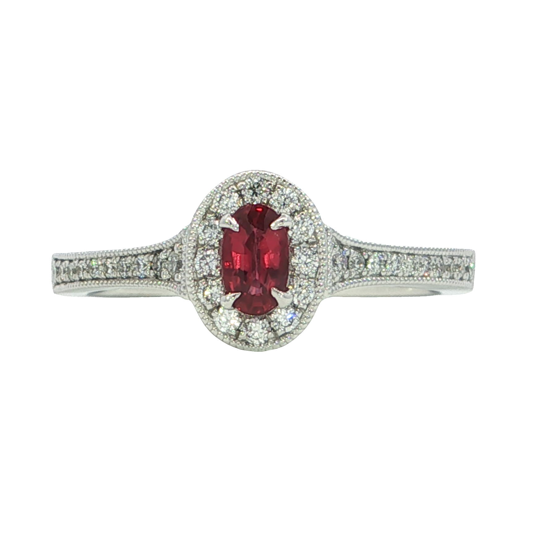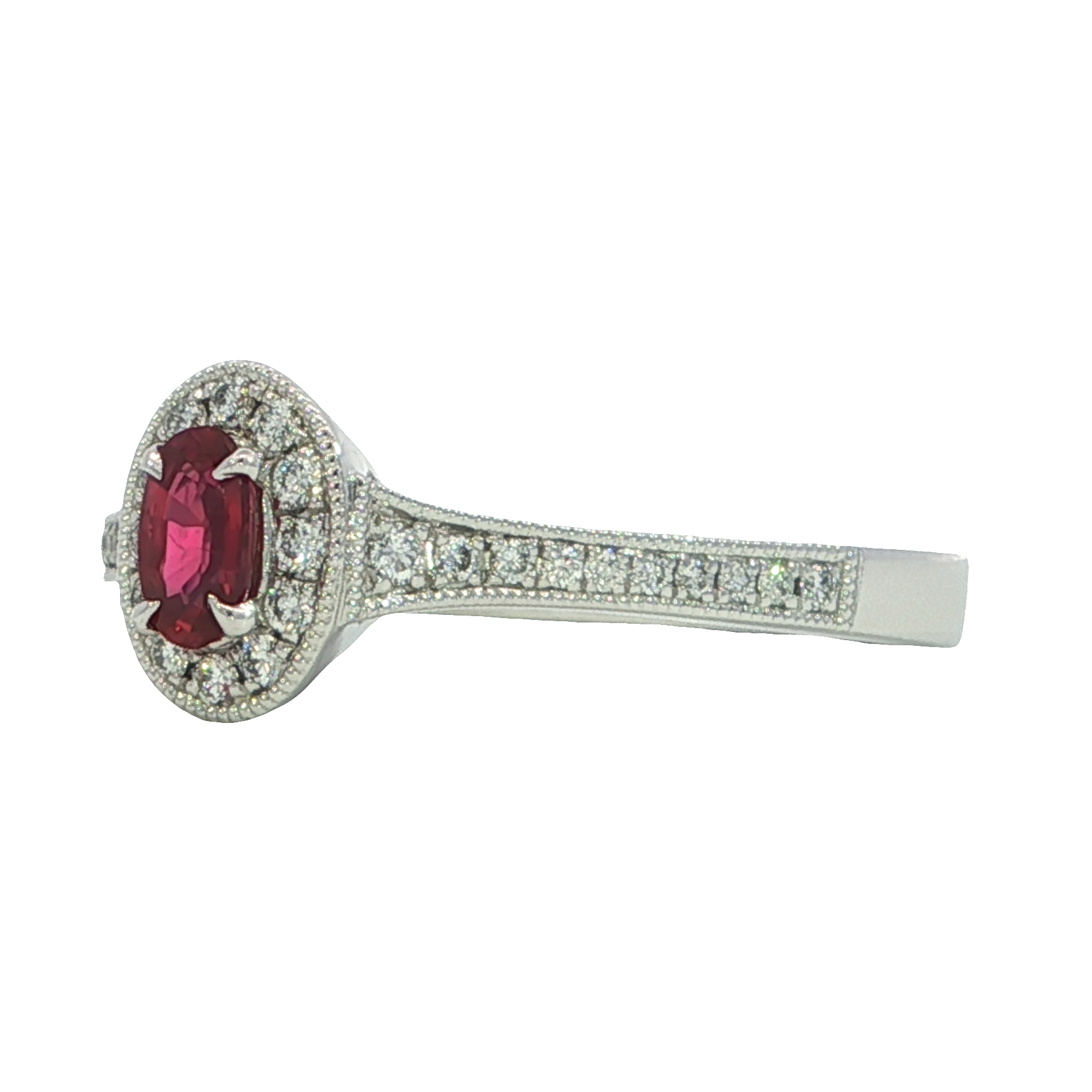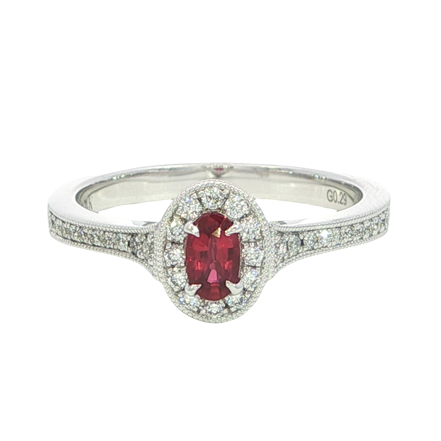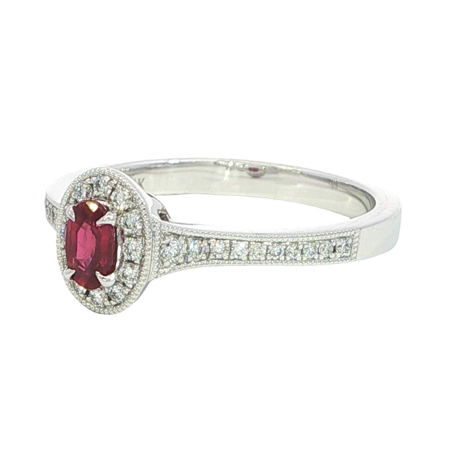 A vibrant oval natural ruby is set in 14k white gold, surrounded by sparkling round diamonds that continue down the band. The natural diamonds, totaling .20 carat with G color and SI2 clarity, create a brilliant frame that enhances the ruby’s rich red hue.