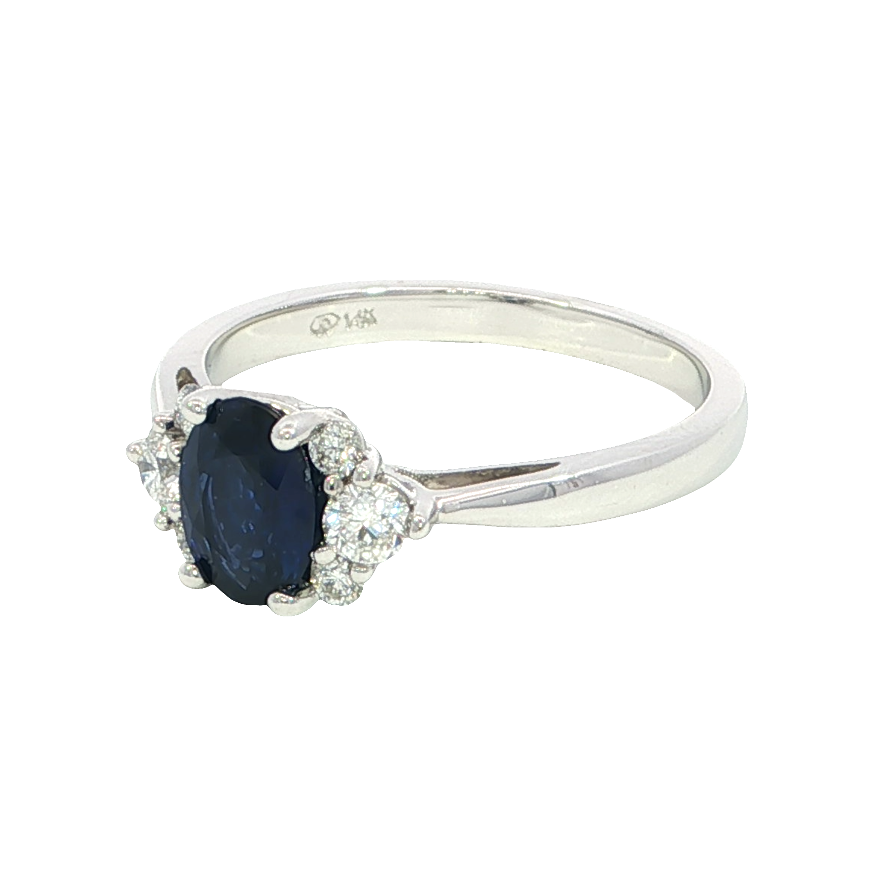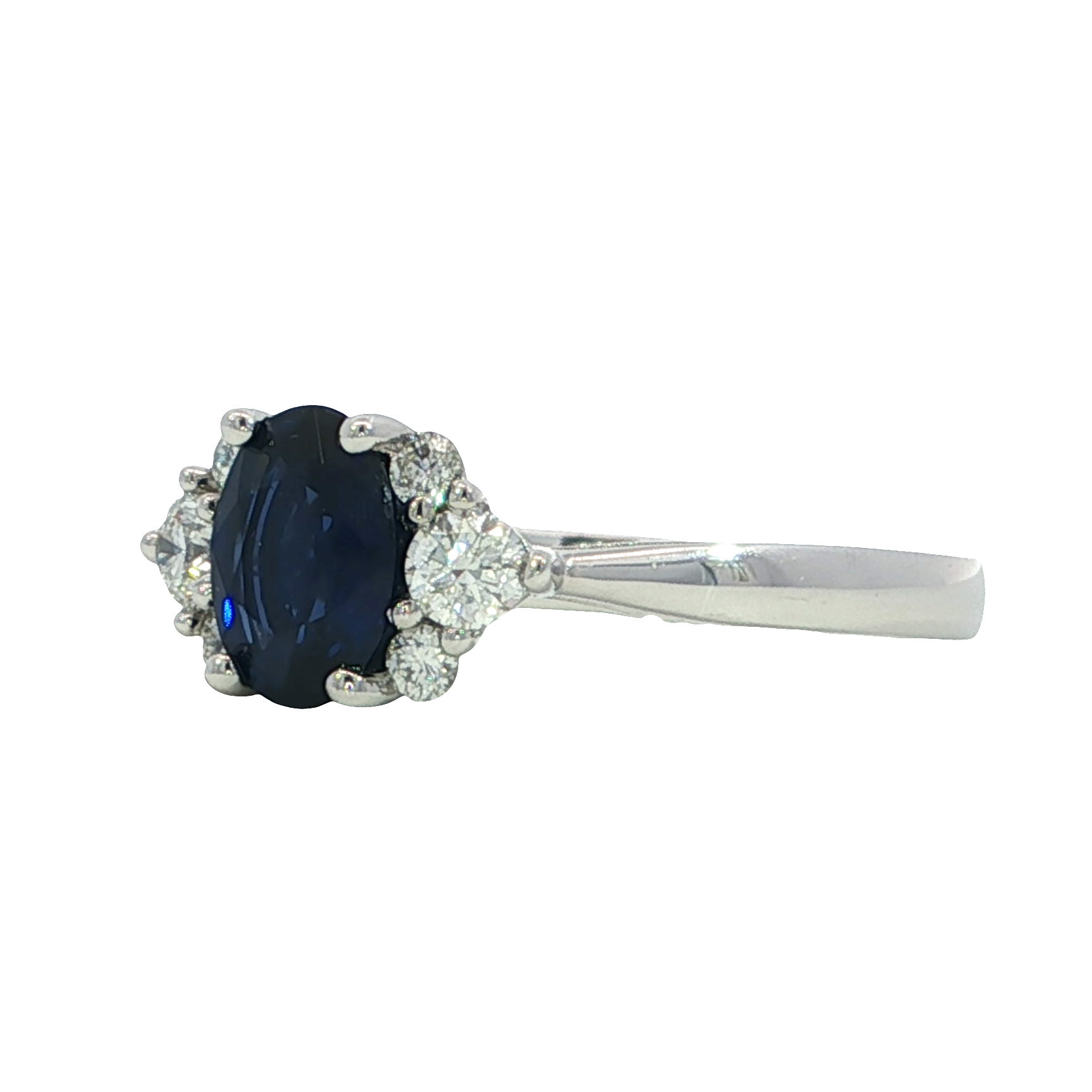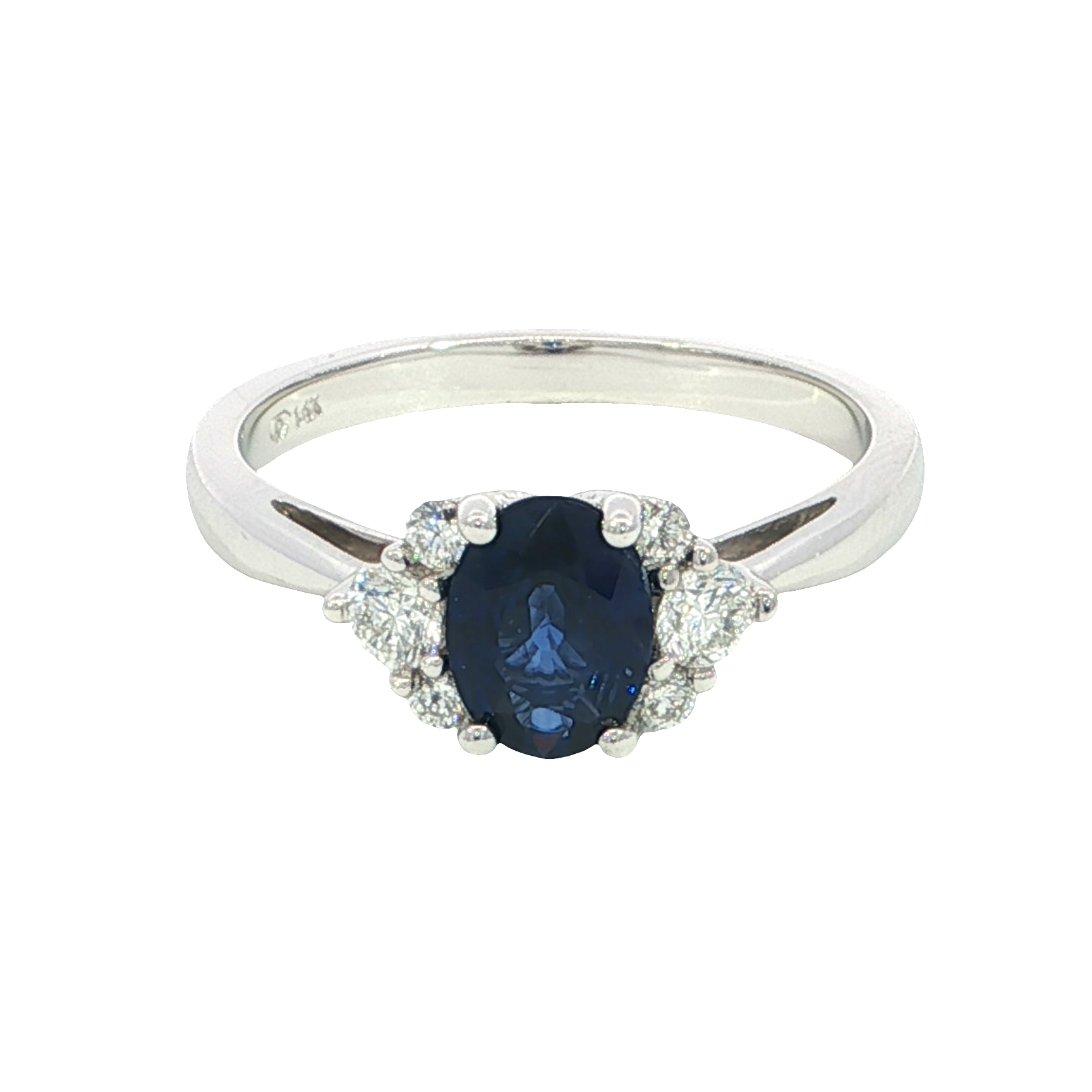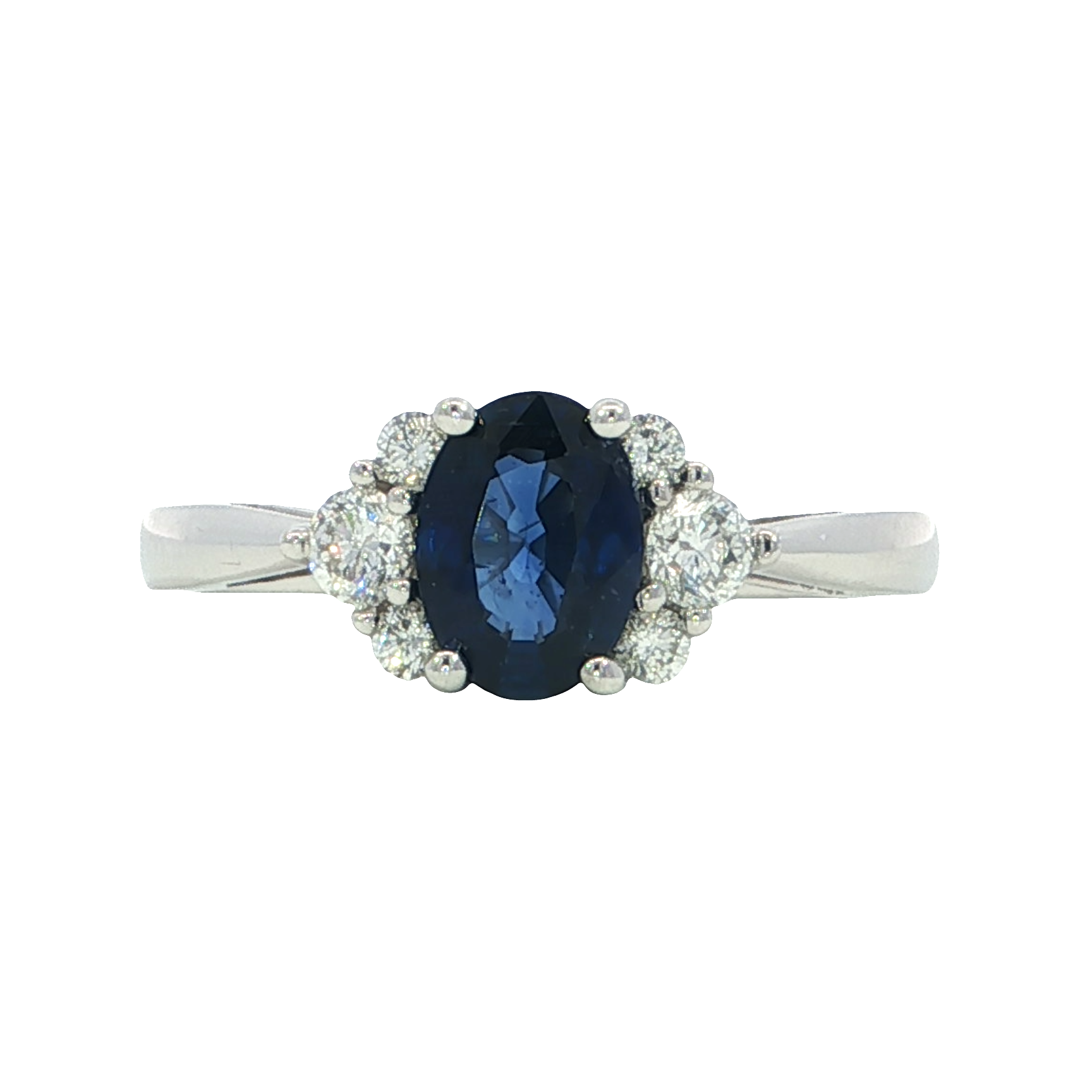 A rich oval sapphire is the centerpiece of this 14k white gold ring, framed by three natural round diamonds on each side. The diamonds, totaling .25 carat with G color and SI2 clarity, add brilliant sparkle that beautifully complements the deep blue gem.