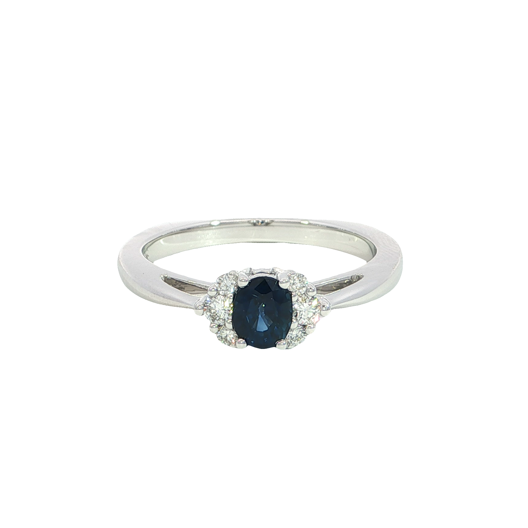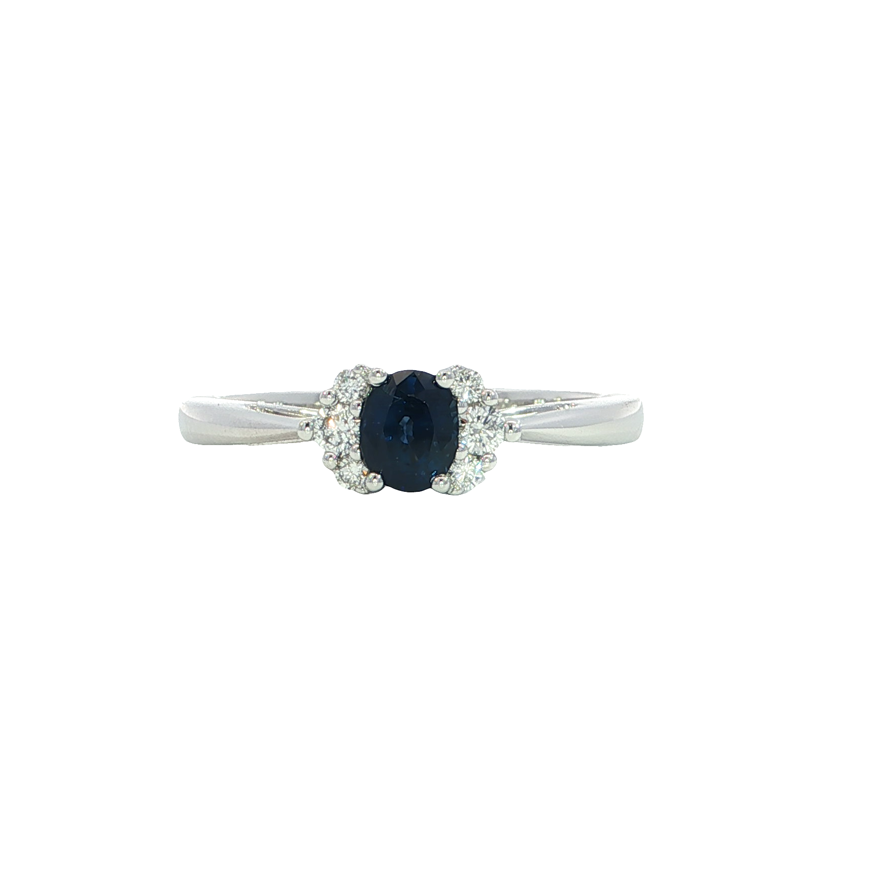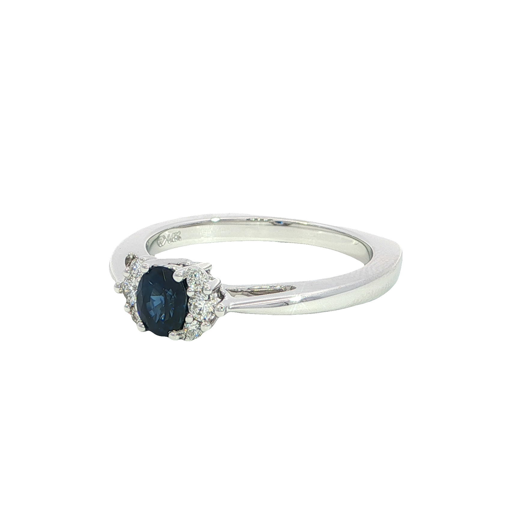 An oval 5x4mm sapphire shines at the center of this 14k white gold ring, embraced by three sparkling round diamonds on each side. The natural diamonds, totaling .14 carat with G color and SI2 clarity, add brilliance to the deep blue gem. A refined European shank completes the look with graceful sophistication.