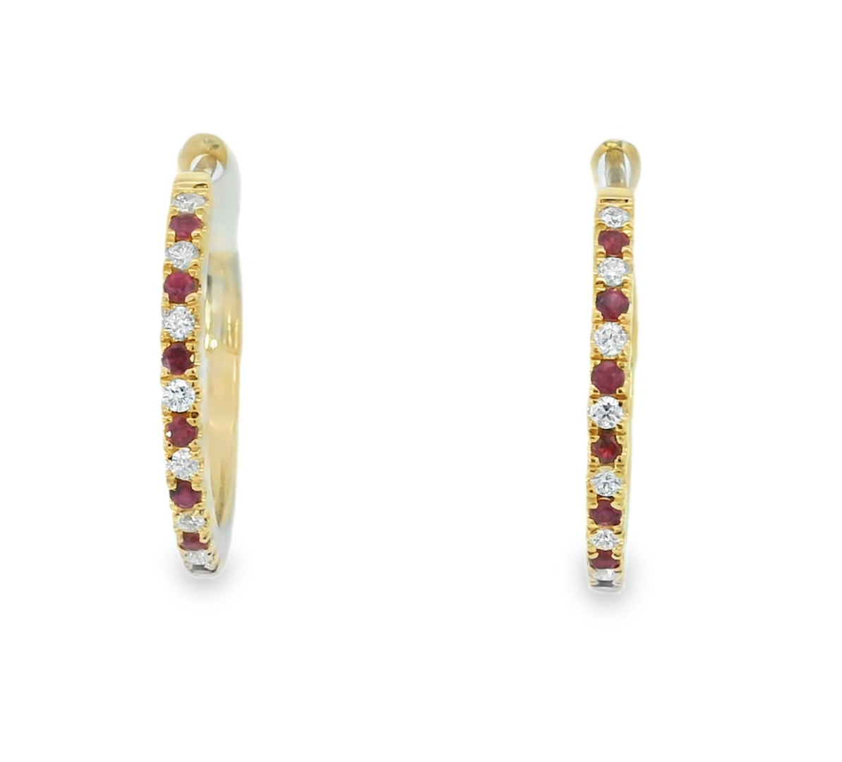 Hoop earrings with ruby and diamonds set every other, diamonds totaling .11ct and rubies totaling .16ct, 14k yellow gold