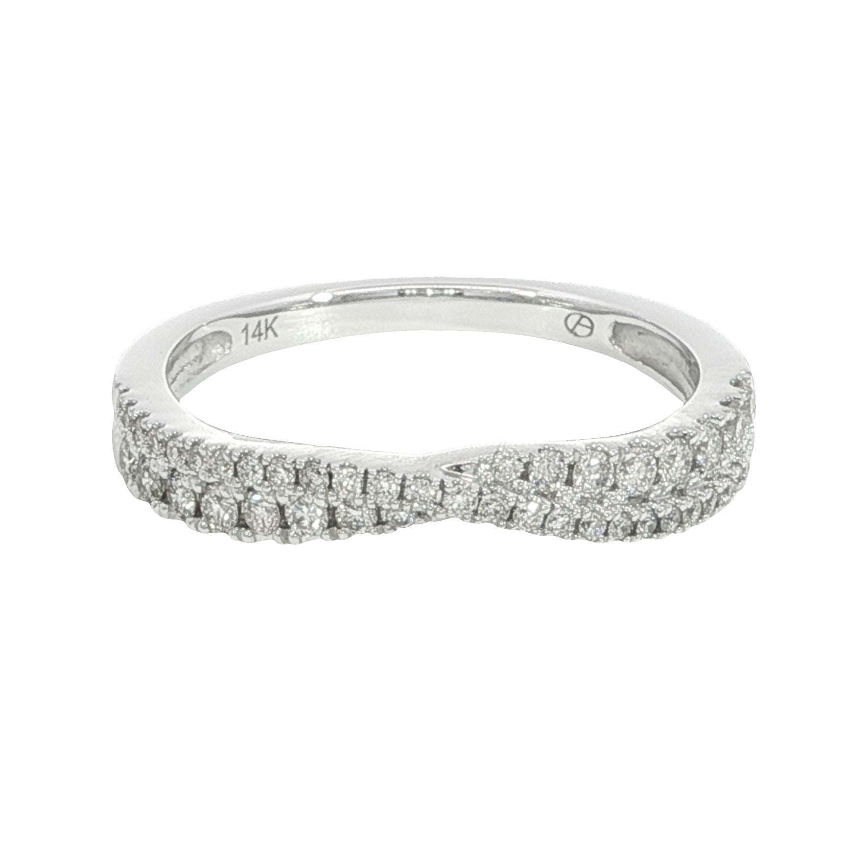 A 14K white gold criss cross ring featuring 31 round natural accent diamonds totaling .33 carats. The diamonds are H color and I1 clarity, adding graceful sparkle to the ring’s flowing intertwined design. Elegant and versatile, it offers a modern touch of brilliance for any occasion.