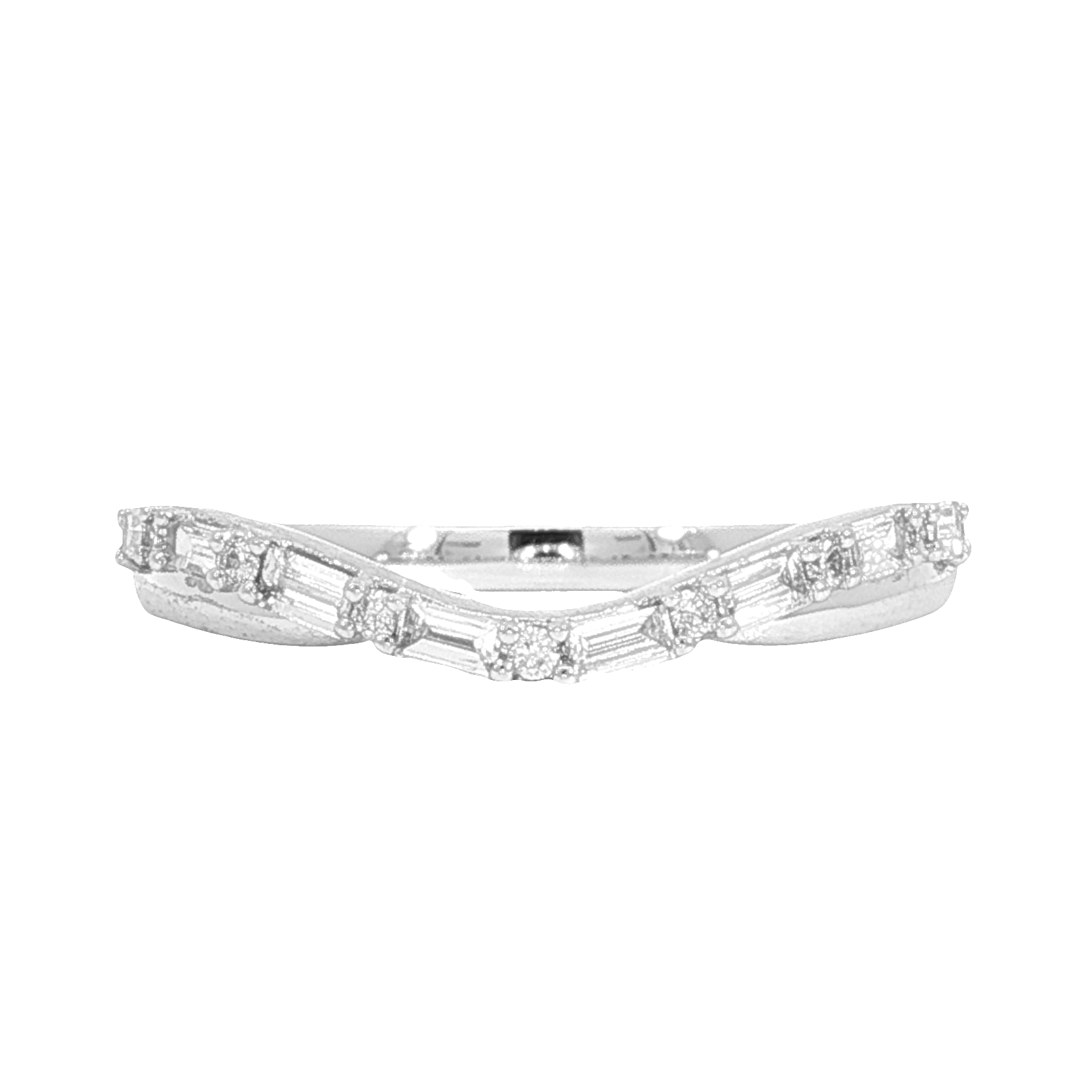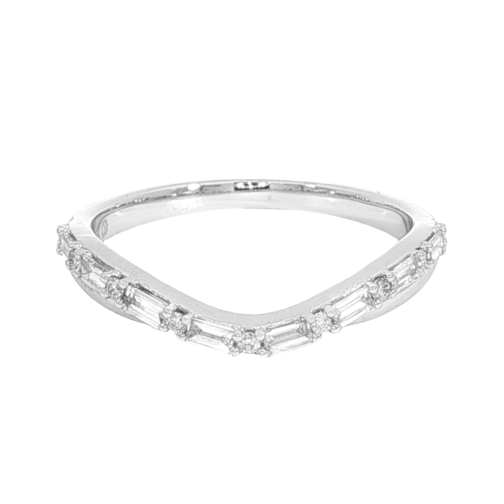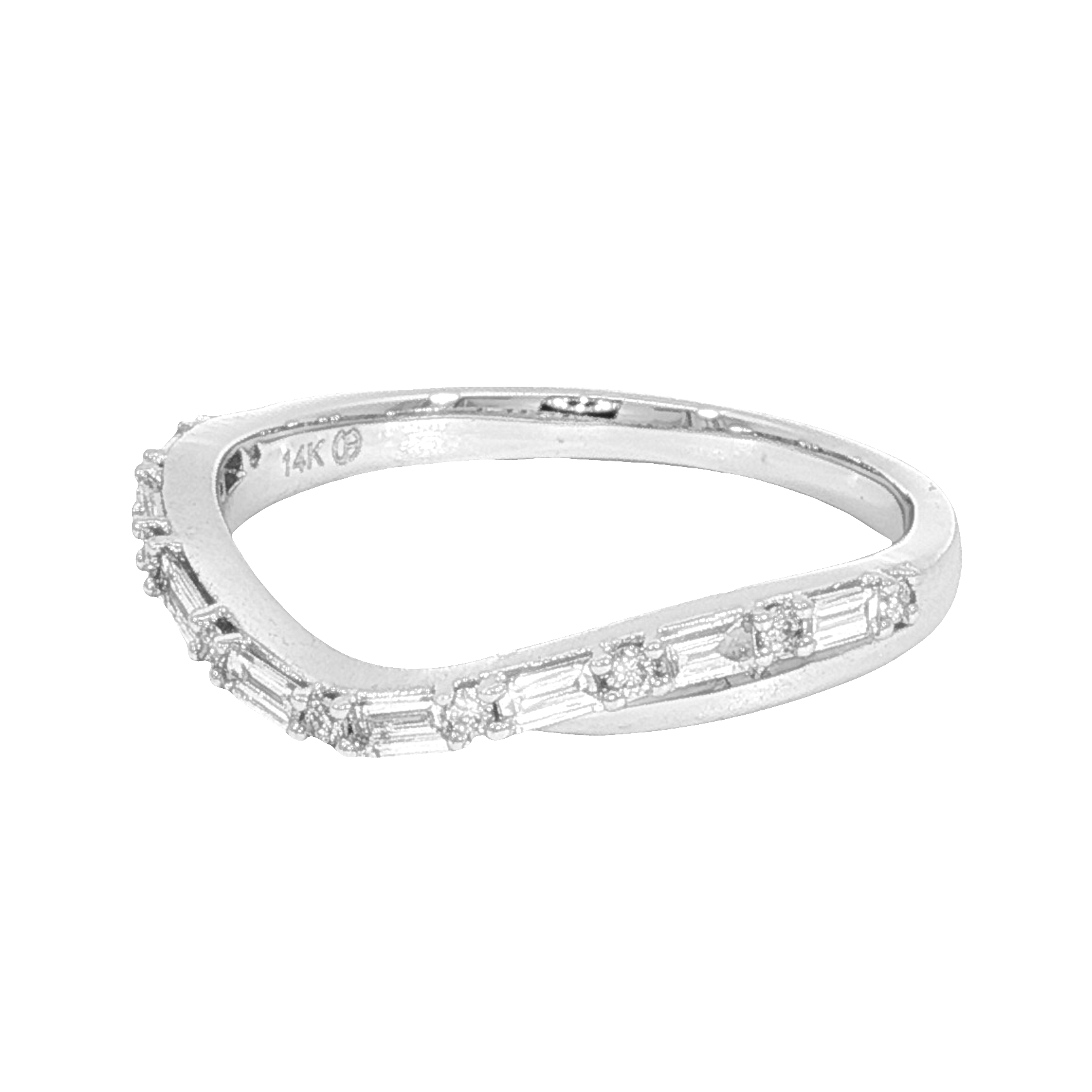 A graceful curved band in 14k white gold, featuring eight baguette diamonds alternating with round natural diamonds. The stones total .26 carat, H color, I1 clarity, creating a striking mix of shape and sparkle.