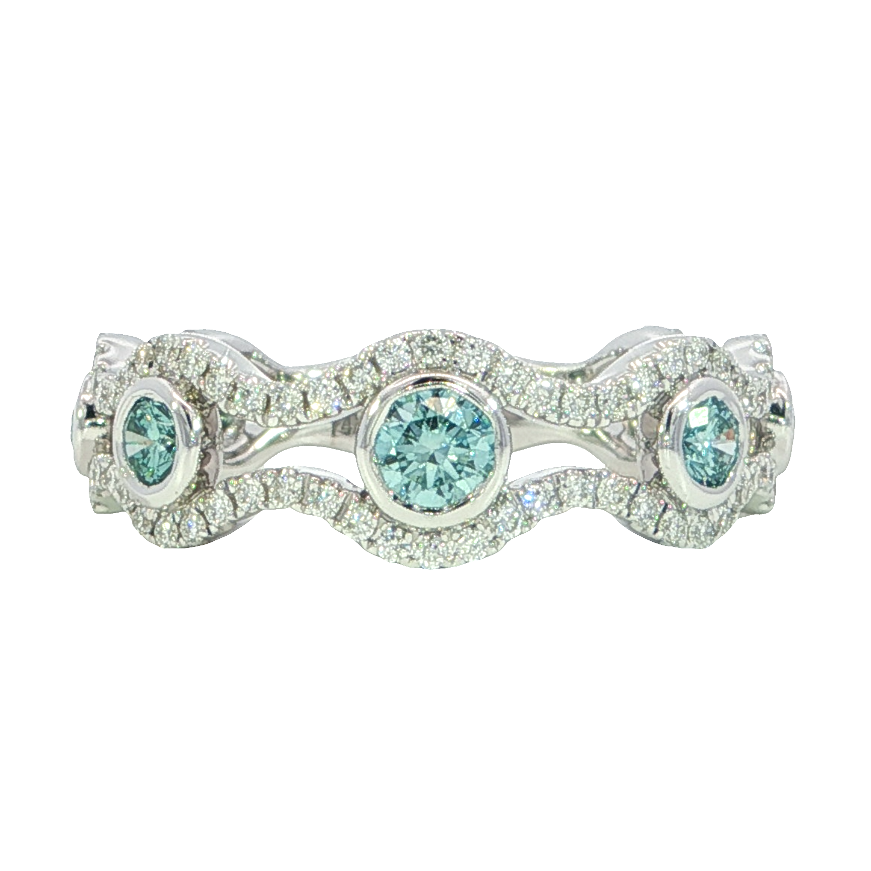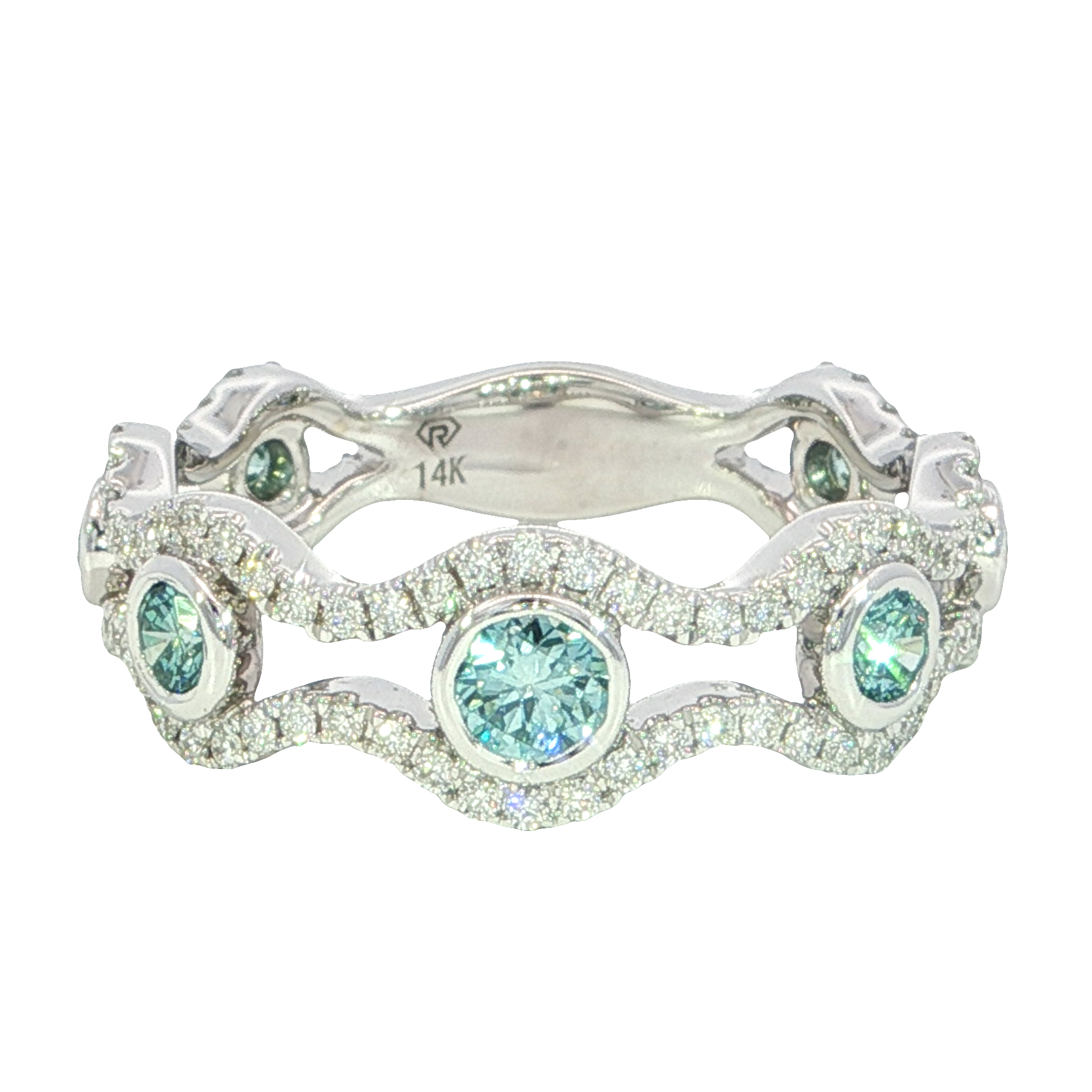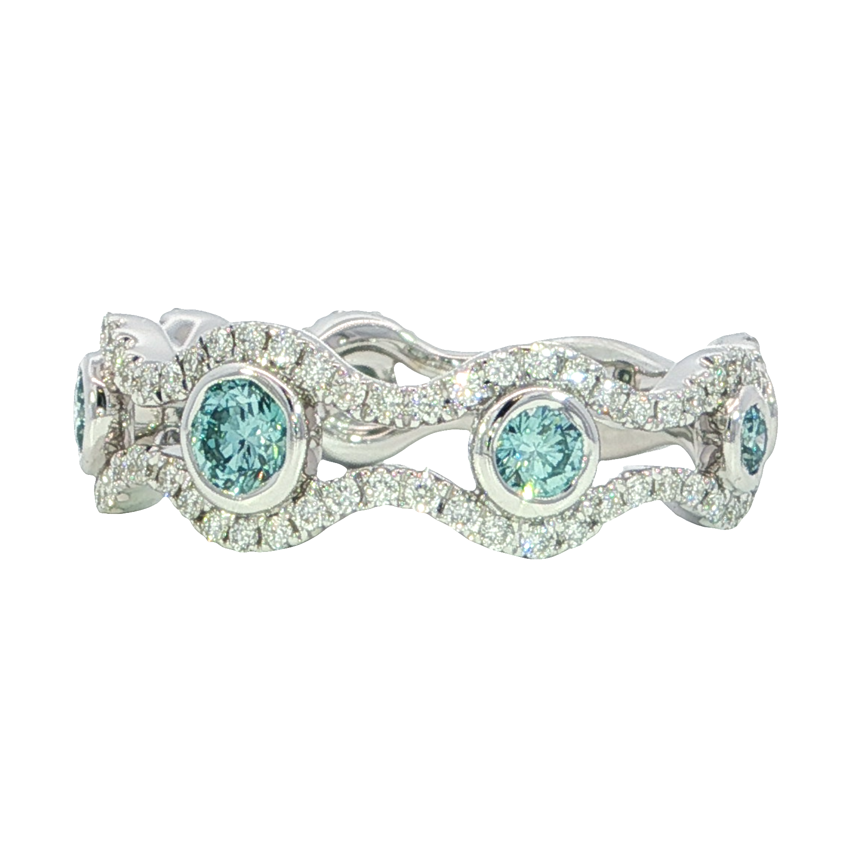 Crafted in 14k white gold, this elegant wavy band features eight bezel set blue irradiated diamonds totaling .50ct, gracefully framed by a flowing row of round natural accent diamonds totaling .37ct. The accent diamonds are G color, SI2 clarity. A striking design that blends fluid movement with vibrant sparkle.