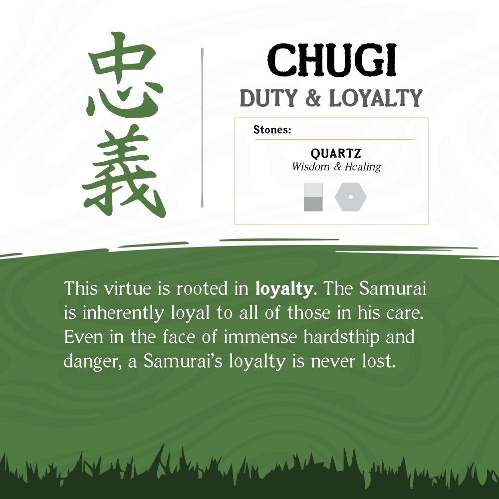 8mm Mokume Gane and White Quartz Beads Bushido Virtue Bracelet -CHUGI: Duty and Loyalty 7.75 inch CHUGI: DUTY AND LOYALTY - This virtue is rooted in loyalty. The Samurai is inherently loyal to all of those in his care. Even in the face of immense hardship and danger, a Samurai’s loyalty is never lost. Stones: White Quartz: Wisdom and Healing