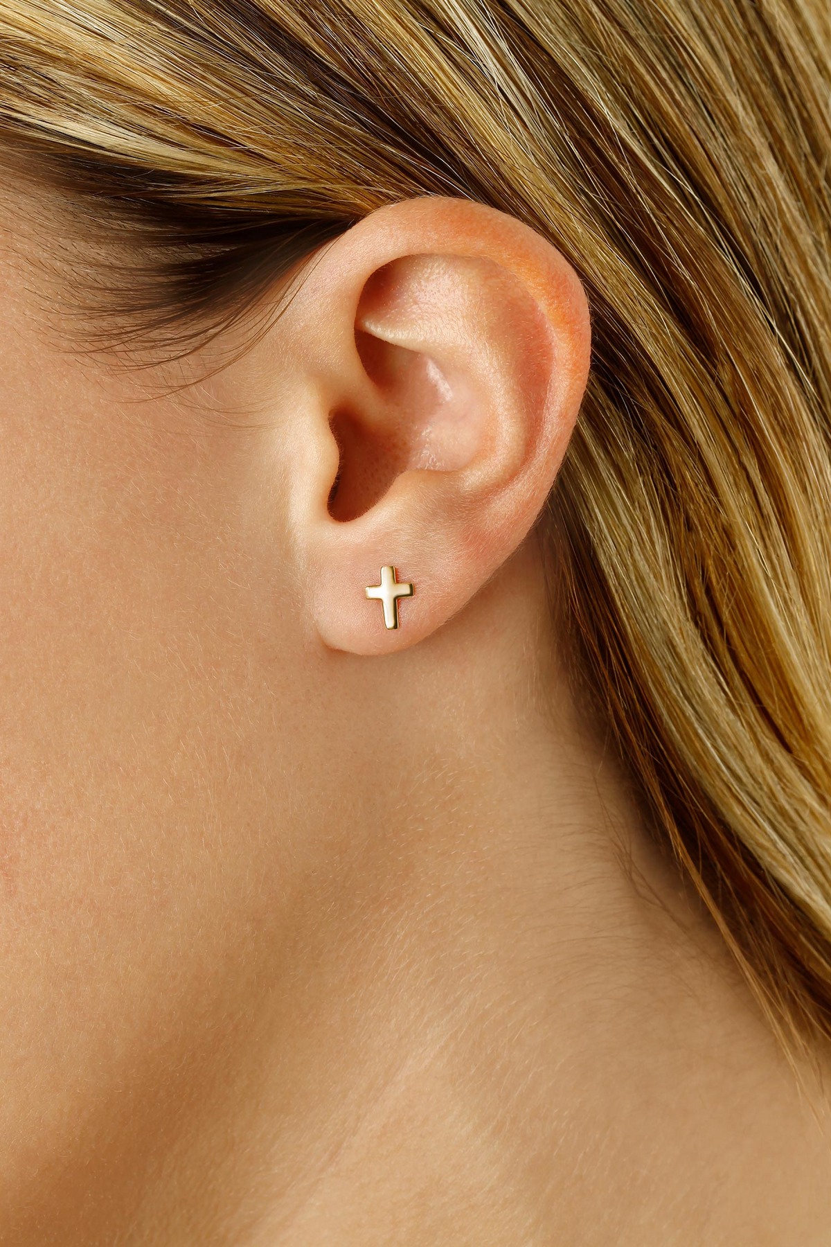 Delicate small flat cross post earrings crafted in 14k yellow gold with a bright high polish finish. A timeless symbol of faith in a simple, elegant design for everyday wear.